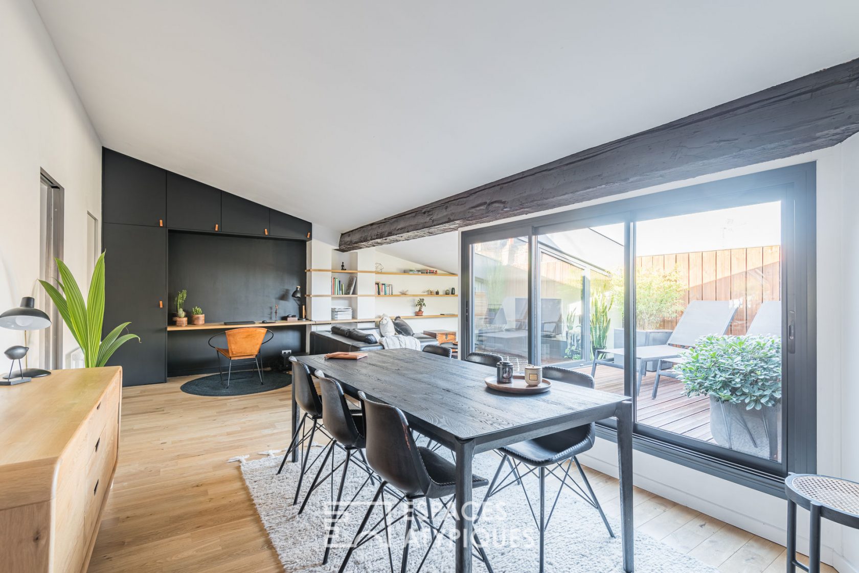 La rénovation contemporaine sublime cet appartement intimiste et cosy. Une pièce de vie lumineuse donne accès à la terrasse tropézienne avec vue sur les toits des Chartrons. Dans la continuité, on découvre une cuisine indépendante entièrement équipée ainsi qu’une salle de bain. Enfin une chambre avec rangement ouverte sur la terrasse vient s’ajouter aux atouts de ce bien de caractère.