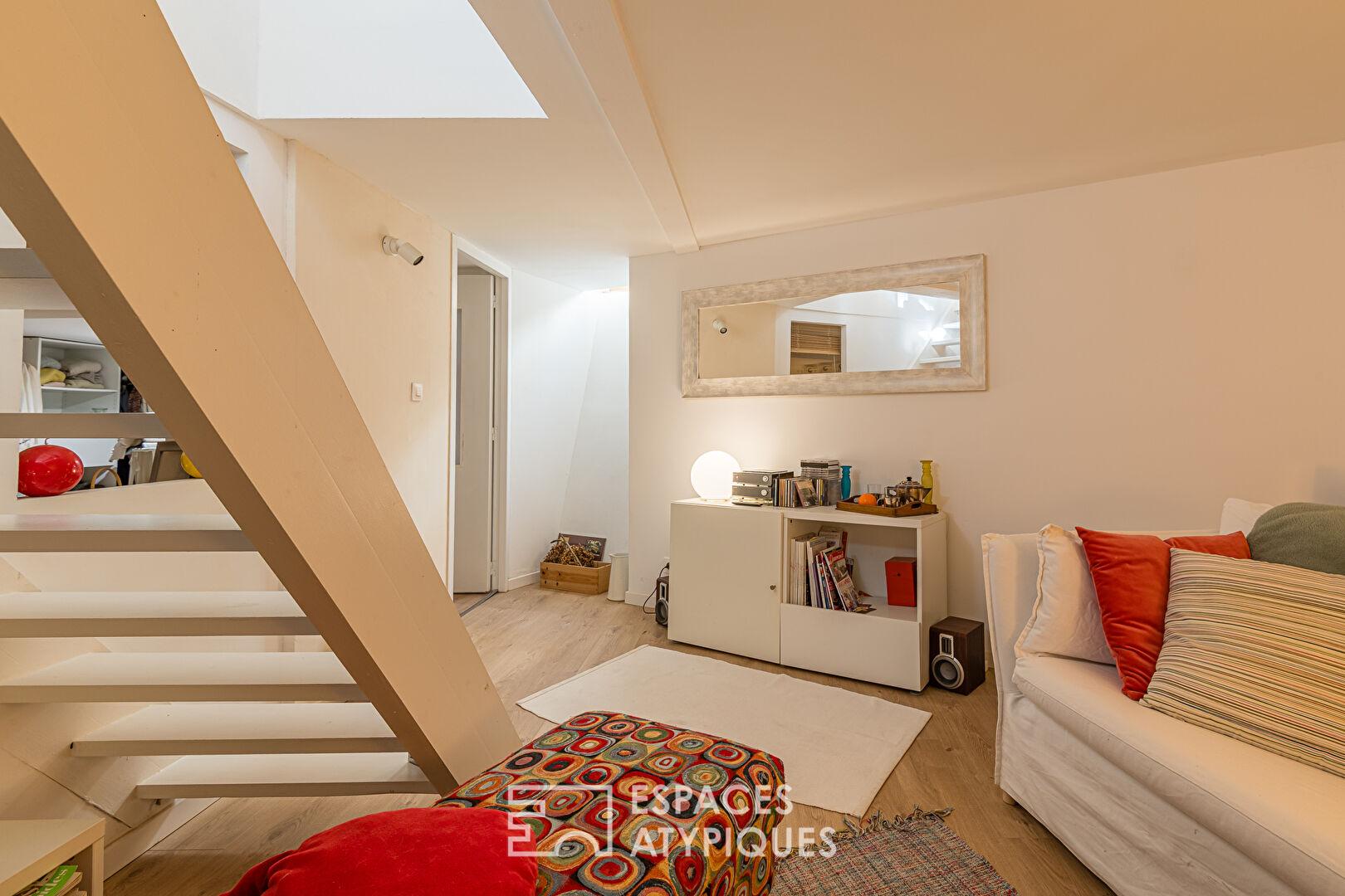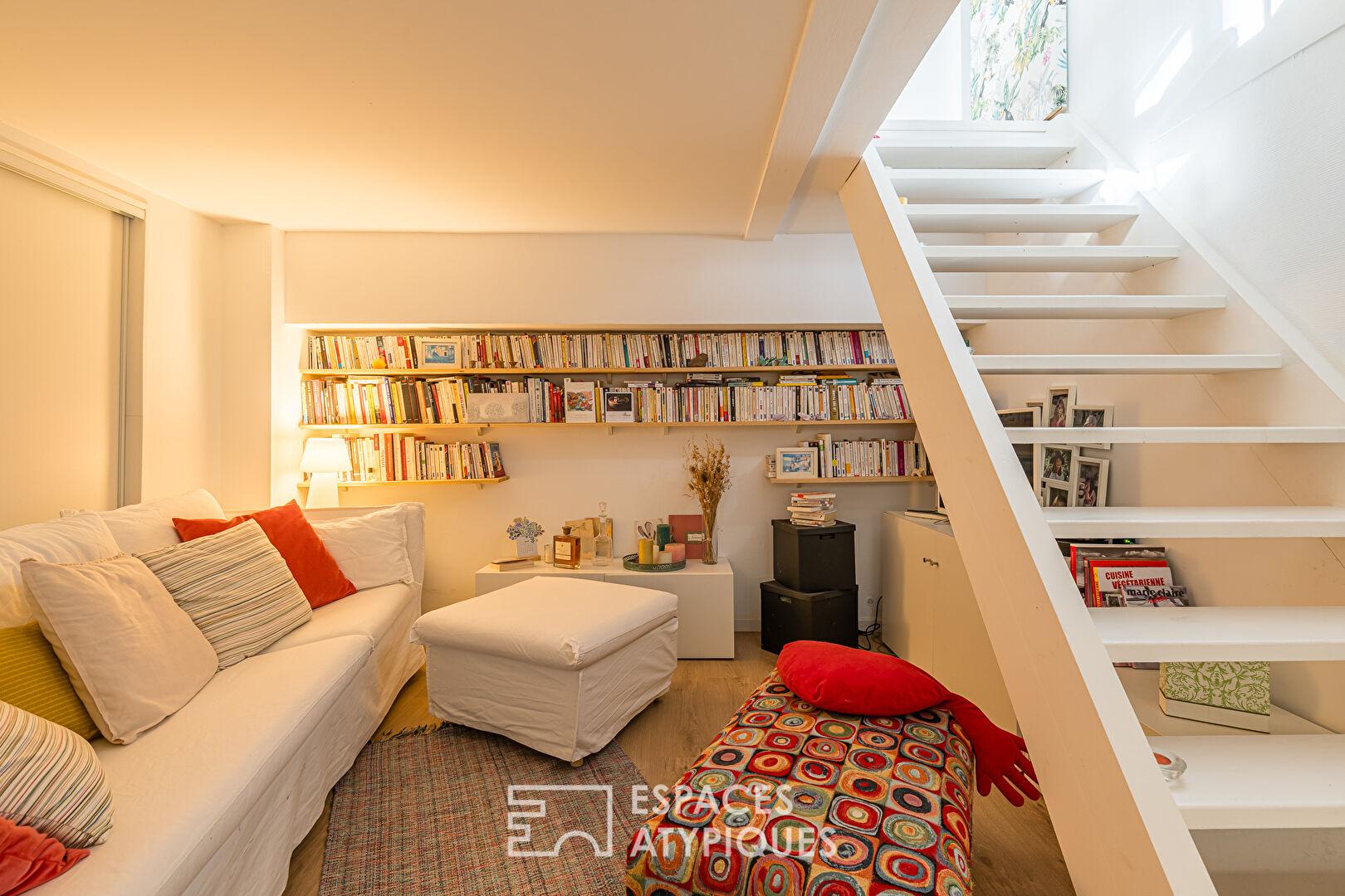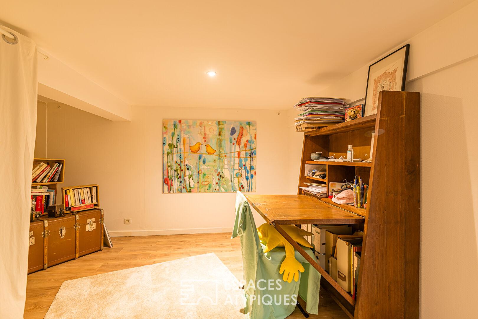 En souplex, un espace salon intimiste, invitant à la détente. Bibliothèque murale, escalier graphique et poutres apparentes composent cette atmosphère unique. Des espaces annexes viennent compléter ce niveau : un dressing et un bureau, offrant des possibilités d’aménagement supplémentaires.