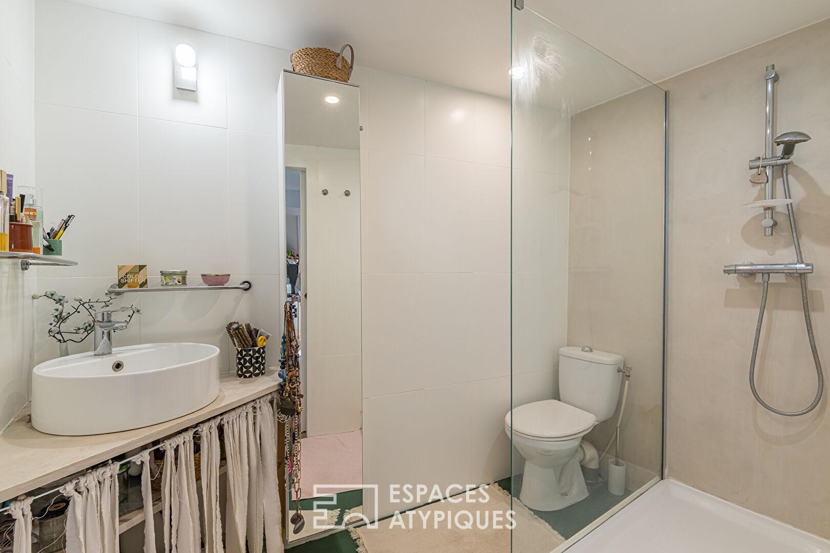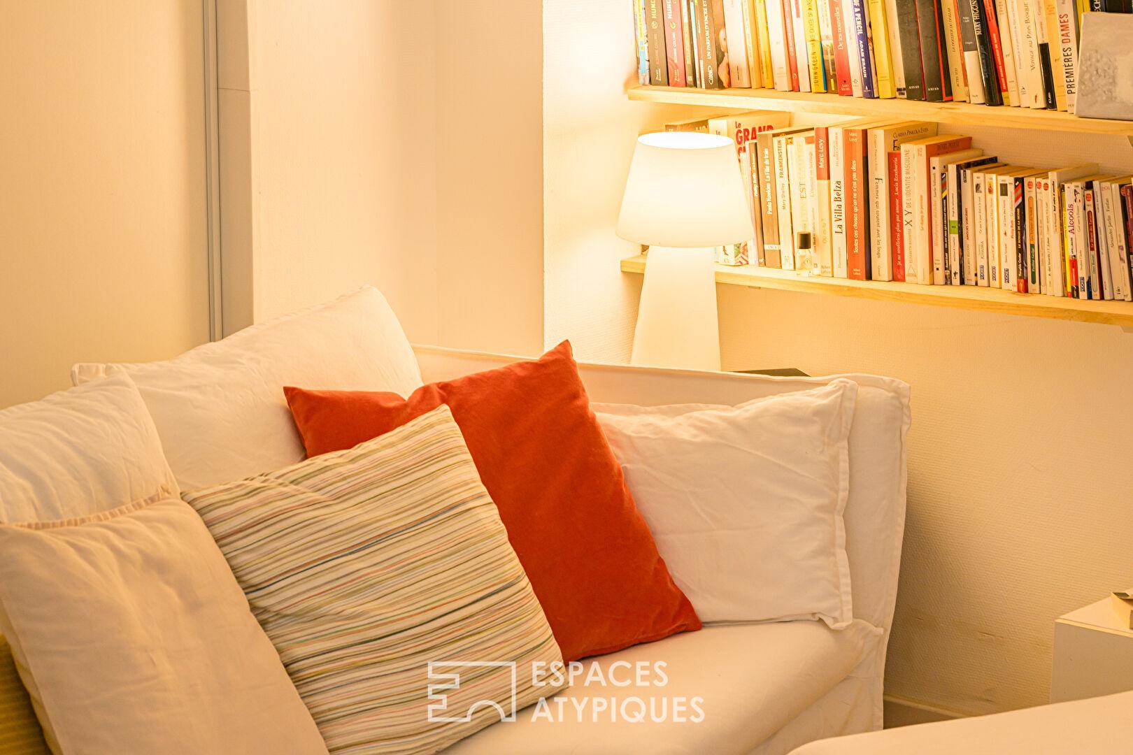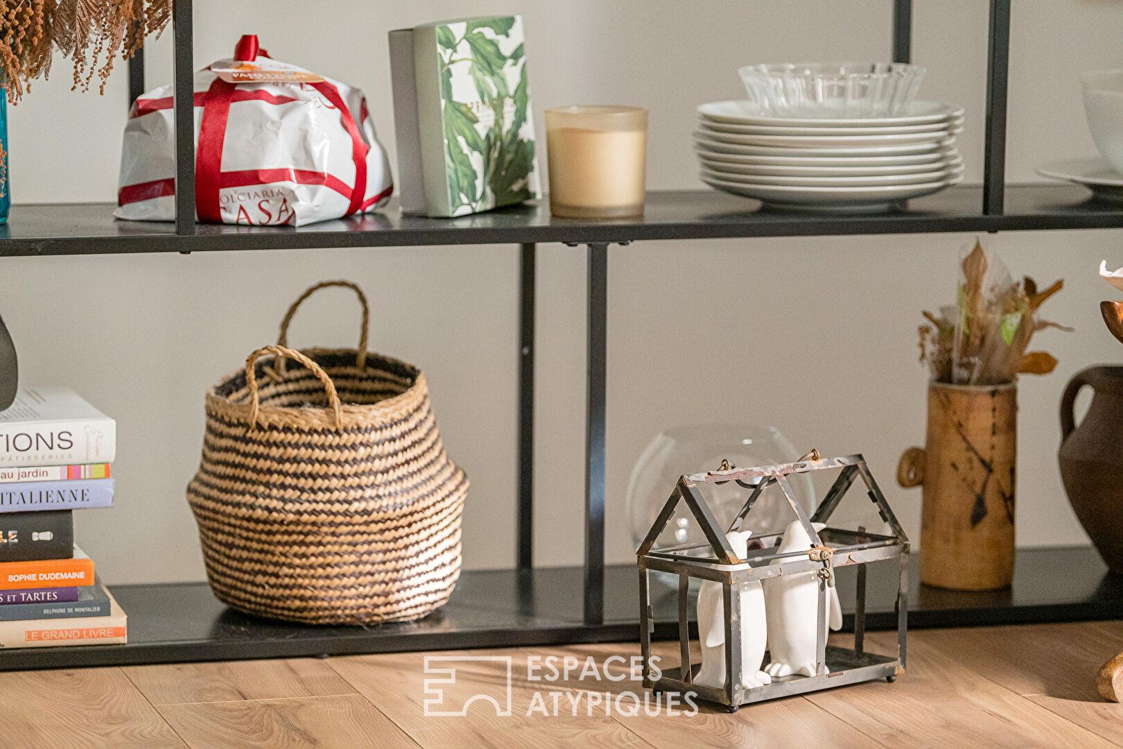 En souplex, un espace salon intimiste, invitant à la détente. Bibliothèque murale, escalier graphique et poutres apparentes composent cette atmosphère unique. Des espaces annexes viennent compléter ce niveau : un dressing et un bureau, offrant des possibilités d’aménagement supplémentaires.