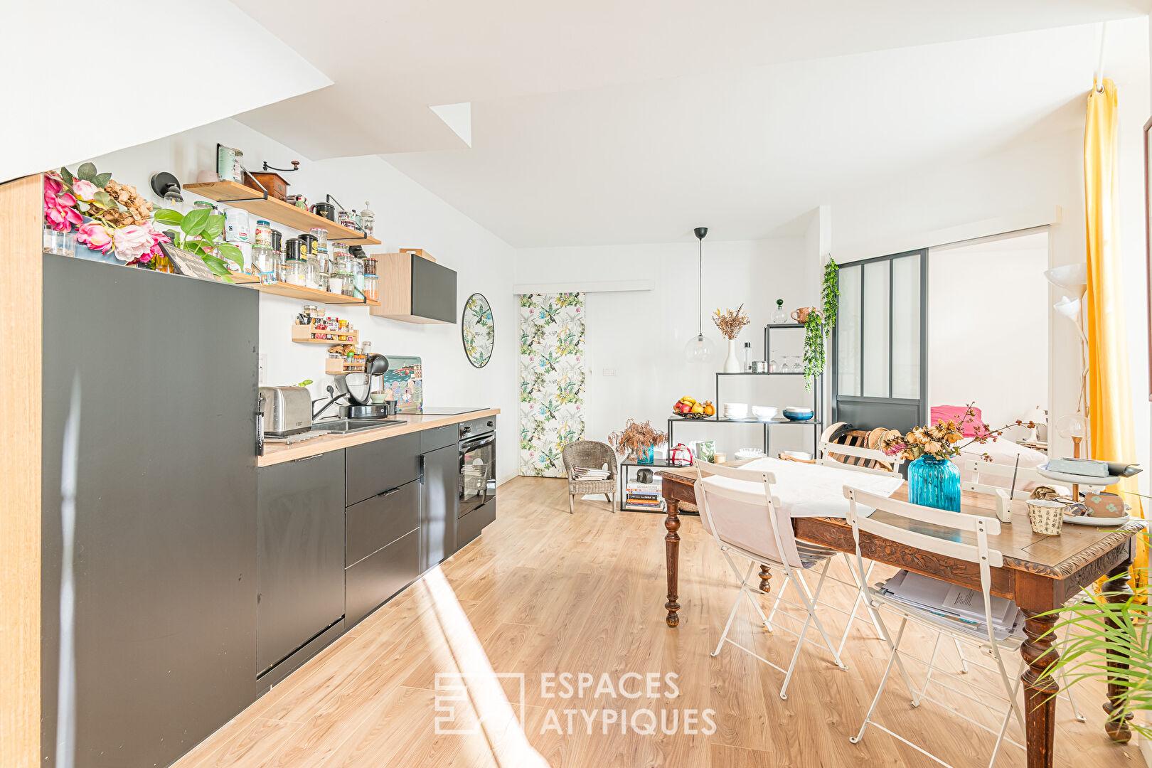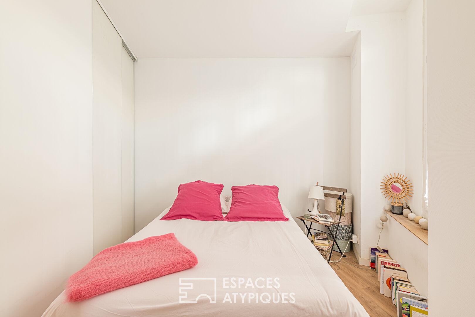 Dès l’entrée, la pièce de vie à la hauteur sous plafond agréable, dévoile une cuisine ouverte aux lignes contemporaines, avec des rangements subtilement intégrés. L’ensemble accueille également une chambre cosy ainsi qu’une salle d’eau épurée avec WC.