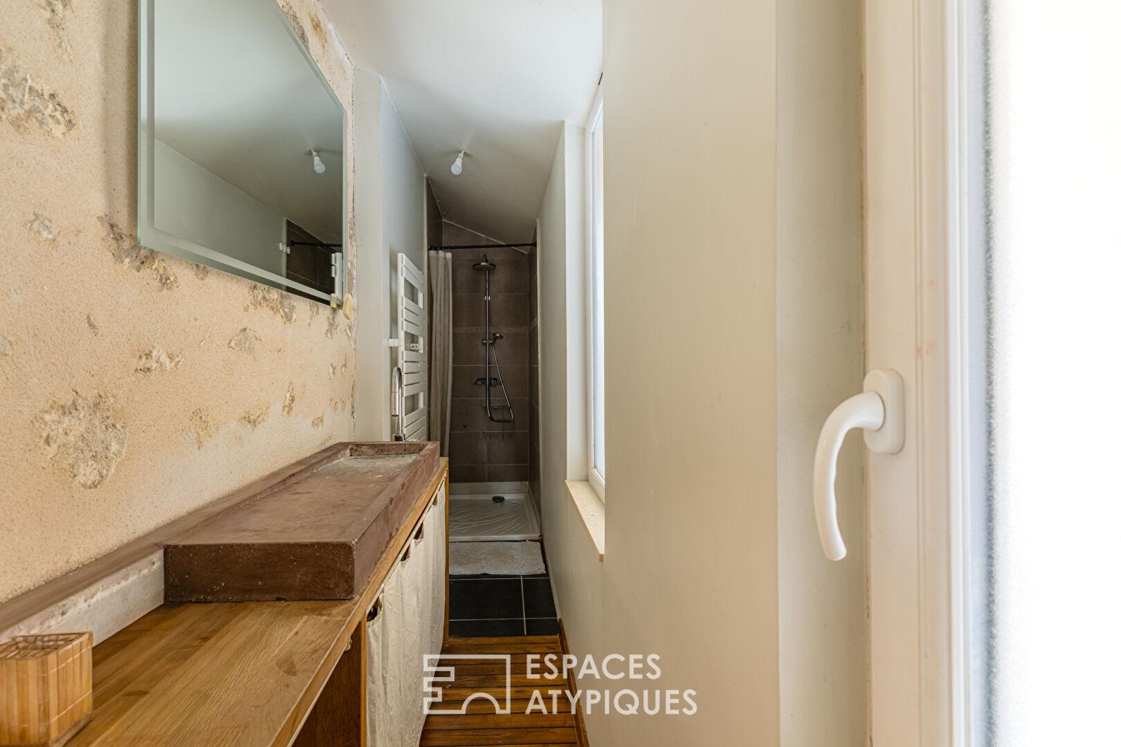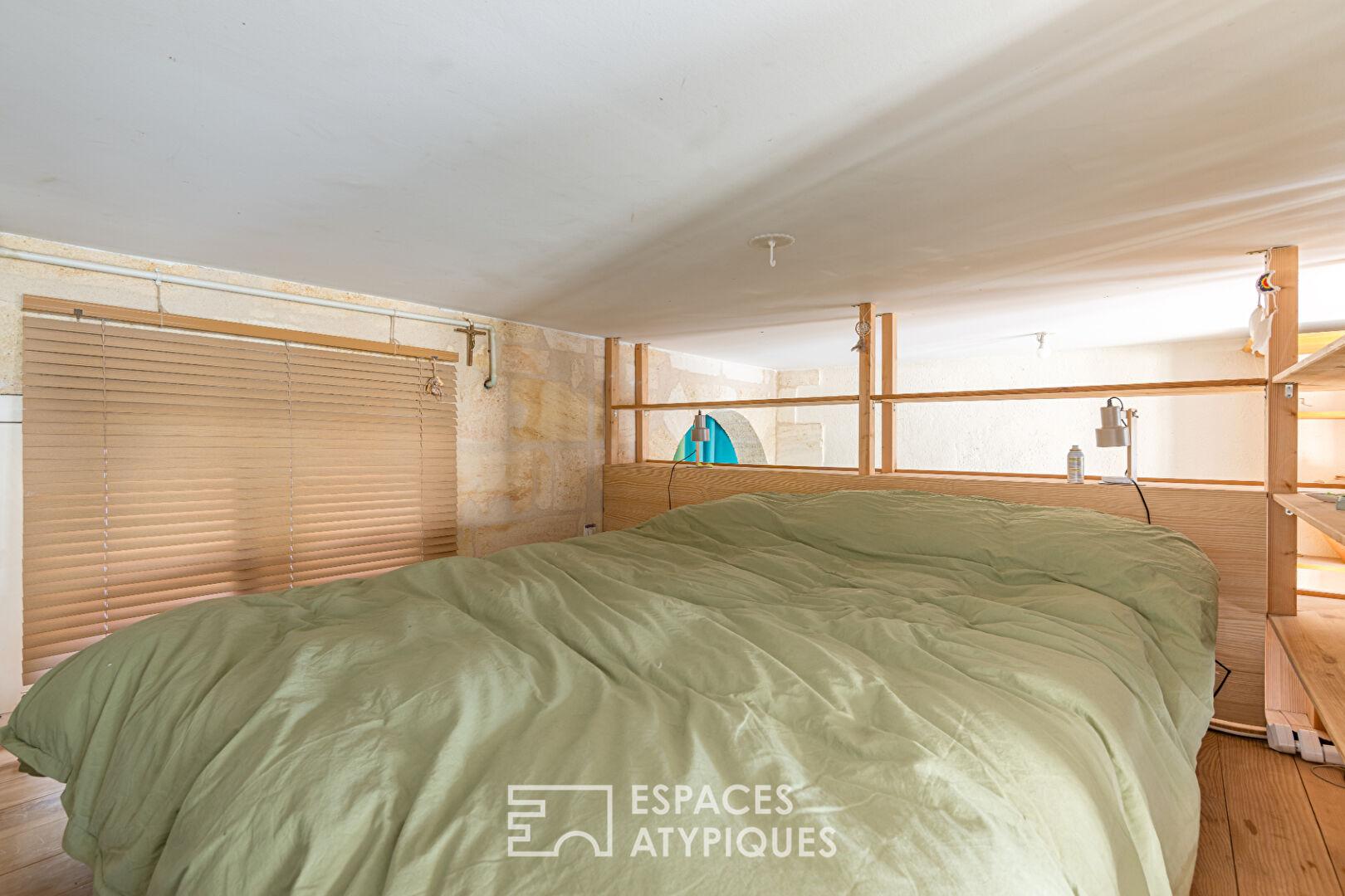 L’entrée dessert, d’un côté, le séjour et, de l’autre, une cuisine équipée, une salle d’eau avec douche à l’italienne et double vasque, ainsi que de nombreux rangements intégrés et des toilettes indépendantes. Une chambre en mezzanine, orientée sur l’extérieur, offre un environnement calme.