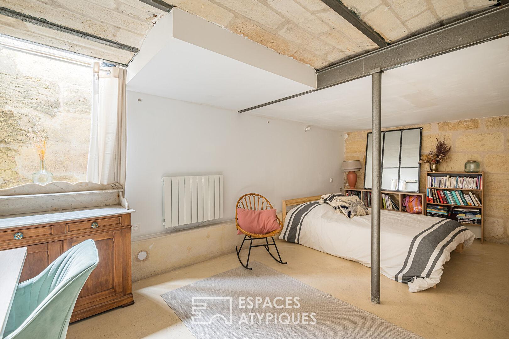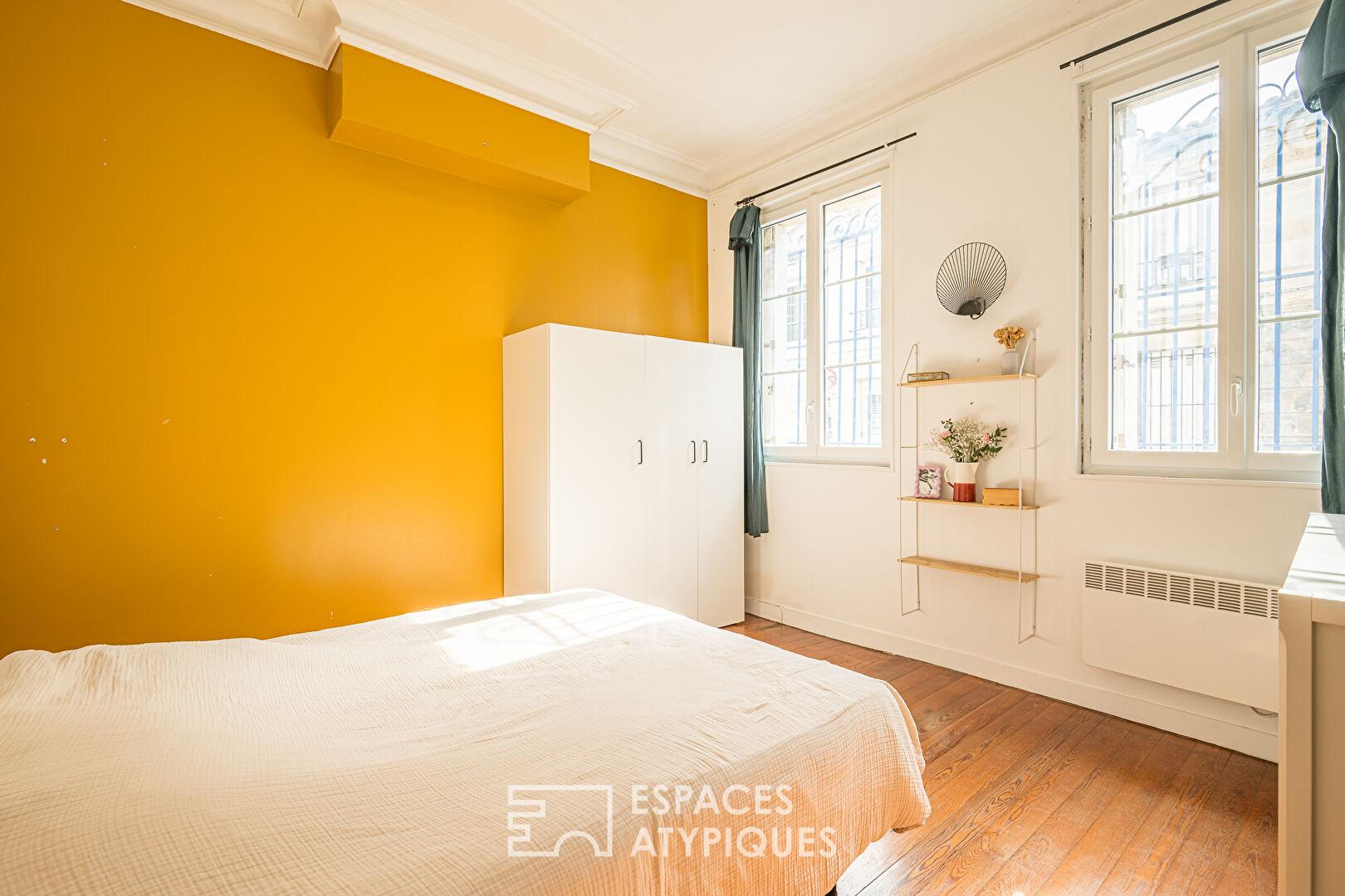 Côté nuit, une chambre de 14 m² se situe côté rue, à proximité de la salle de bains. Près de l’entrée, un bureau ou chambre d’appoint en second jour ainsi qu’un WC indépendant complètent ce niveau.