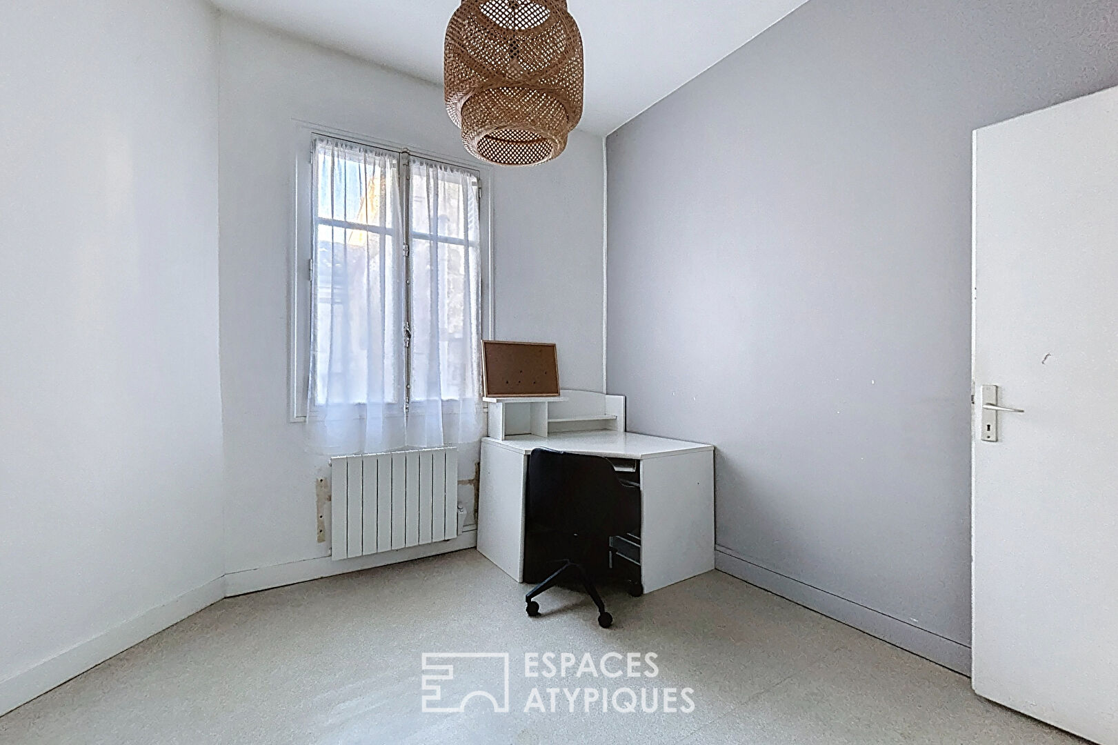 L’accès mène à un séjour lumineux où un escalier en bois crée une ambiance chaleureuse et authentique. Les volumes permettent plusieurs configurations de vie. Une cuisine indépendante jouxte la pièce principale et bénéficie d’une fenêtre apportant lumière et ventilation naturelle. L’étage accueille une chambre ainsi qu’un second espace pouvant devenir bureau ou dressing selon les besoins. La salle d’eau et le WC complètent l’ensemble. Les sols en bois, les ouvertures et la distribution en duplex apportent un vrai caractère à l’appartement, laissant place à une rénovation sur mesure.