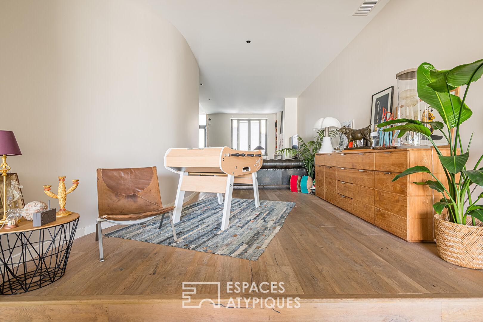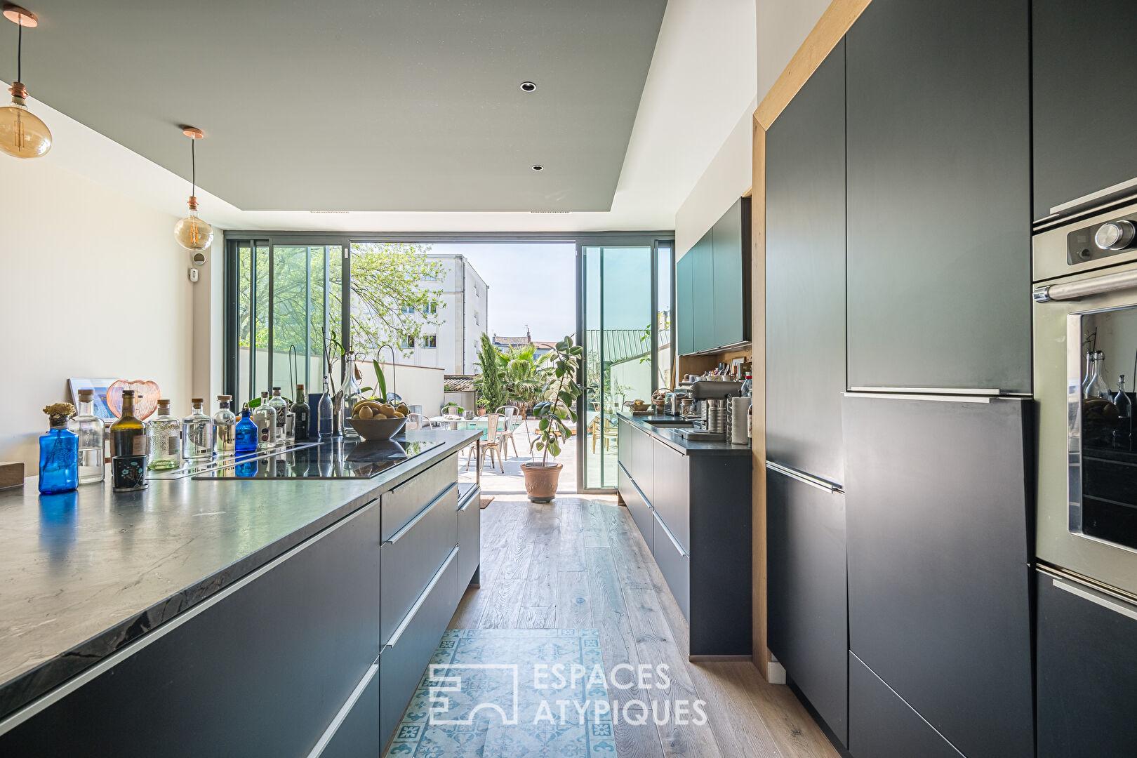 Dès le rez-de-chaussée, la pièce de vie séduit par ses volumes et sa luminosité, renforcée par de larges baies vitrées ouvrant sur le jardin. La cuisine ouverte, véritable espace de partage, se distingue par ses matériaux haut de gamme, dont un vaste plan de travail en marbre, ainsi que par la qualité de ses équipements et de ses finitions.