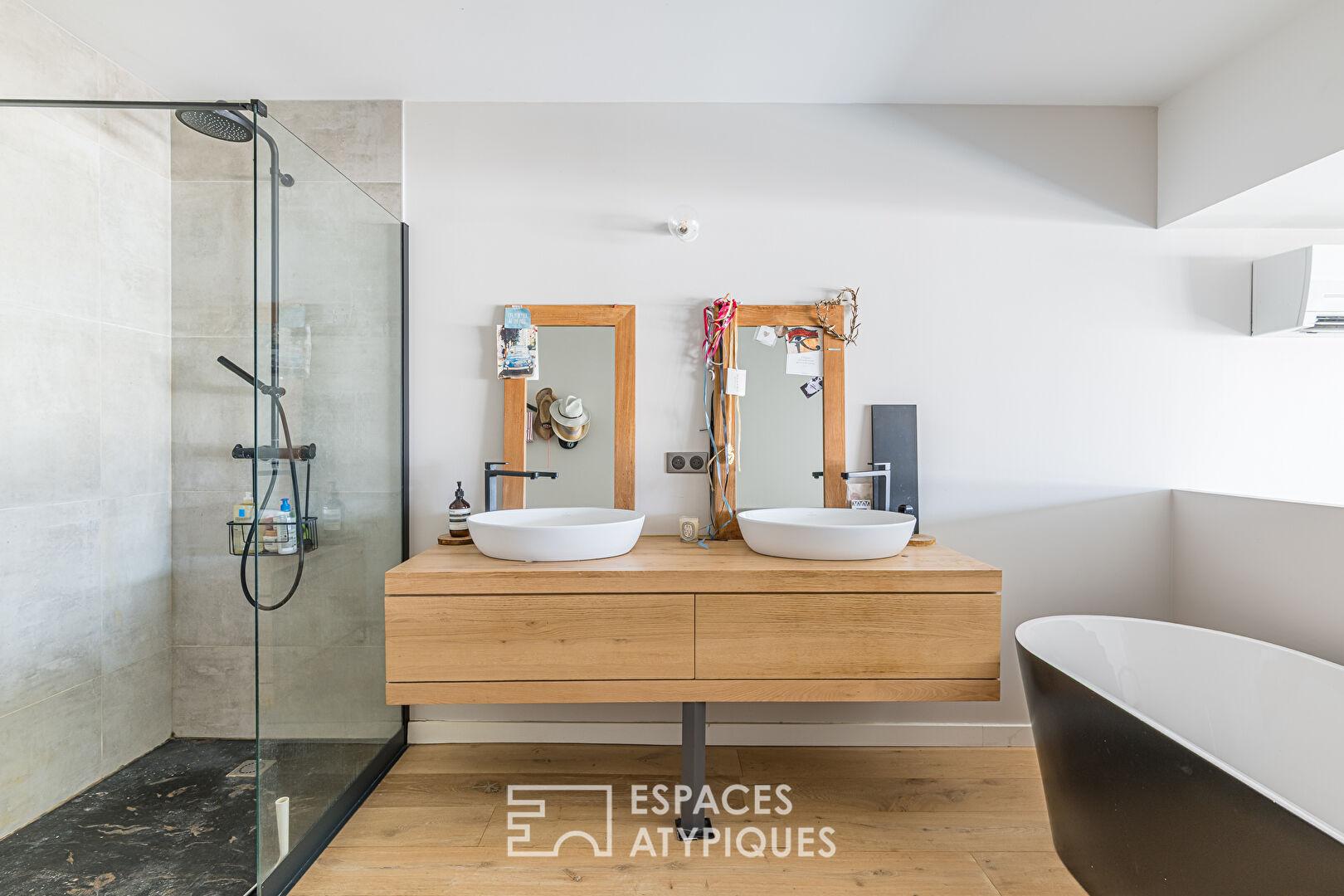 Le premier étage accueille une suite parentale confortable avec dressing sur mesure et salle de bain avec douche à l’italienne et baignoire, ainsi qu’une seconde suite avec salle d’eau, bénéficiant de prestations de qualité.