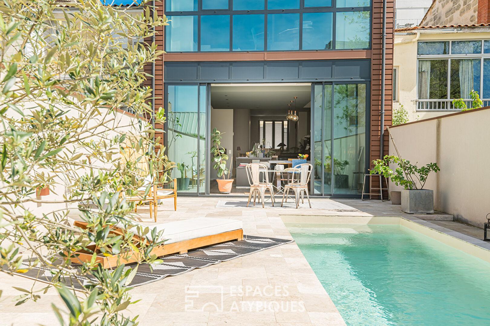 L’extérieur, organisé autour d’un jardin de 120 m² avec piscine, prolonge harmonieusement les espaces intérieurs et offre un cadre agréable et facile à vivre.