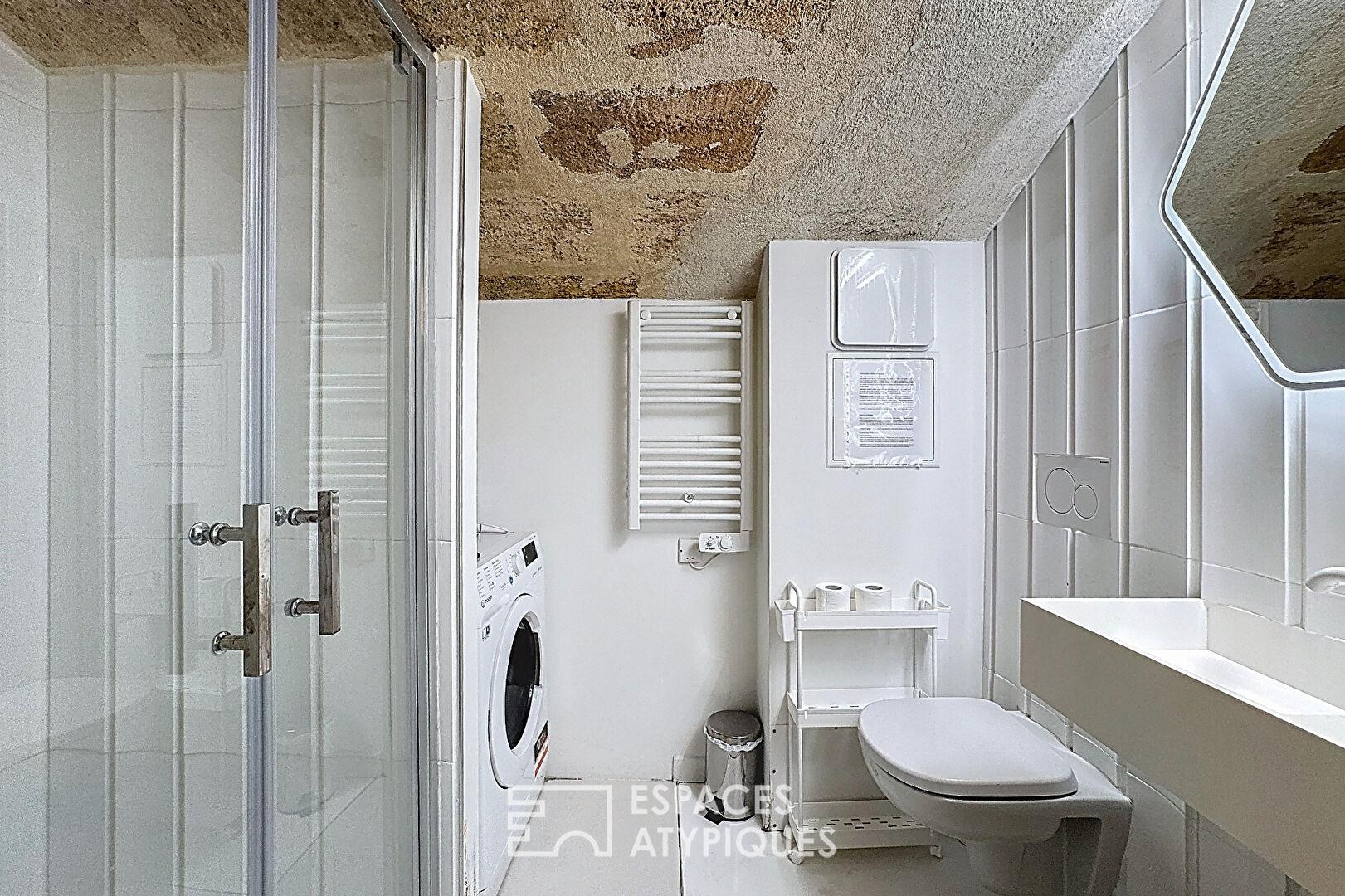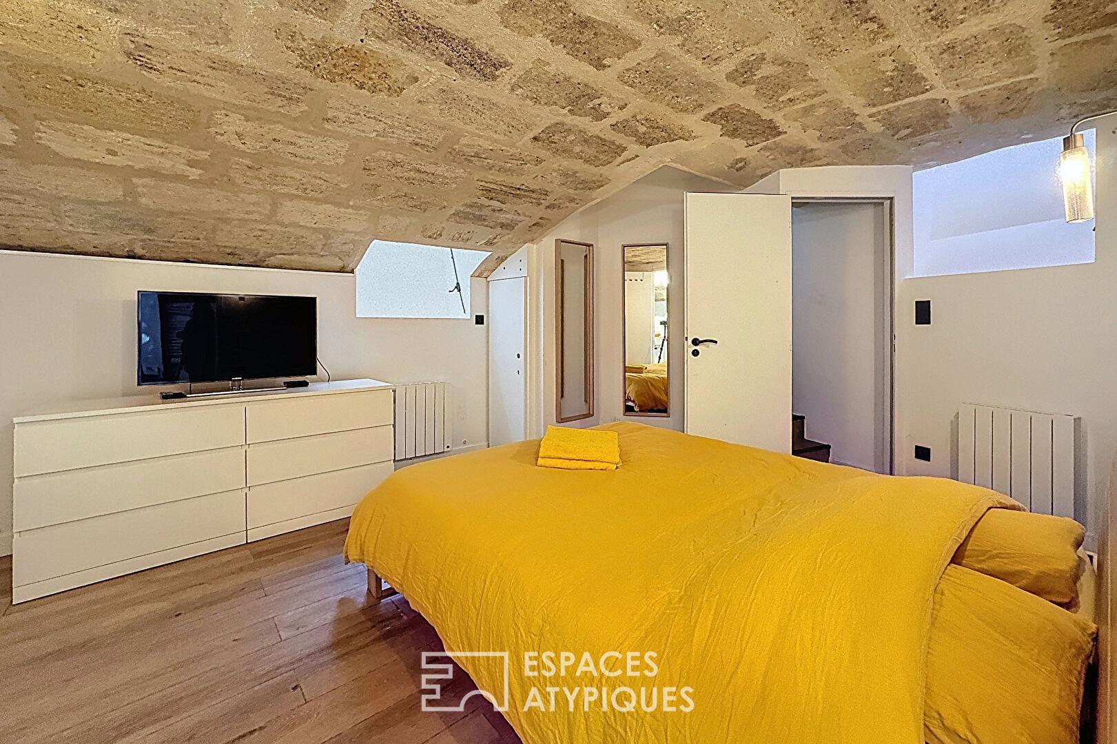 Dès l’entrée, l’espace de vie séduit par son atmosphère chaleureuse et sa configuration optimisée. L’appartement dévoile en souplex une chambre de 20 m² comprenant également une salle d’eau. Les pierres apparentes y apportent un cachet rare et une ambiance feutrée, créant un véritable cocon.