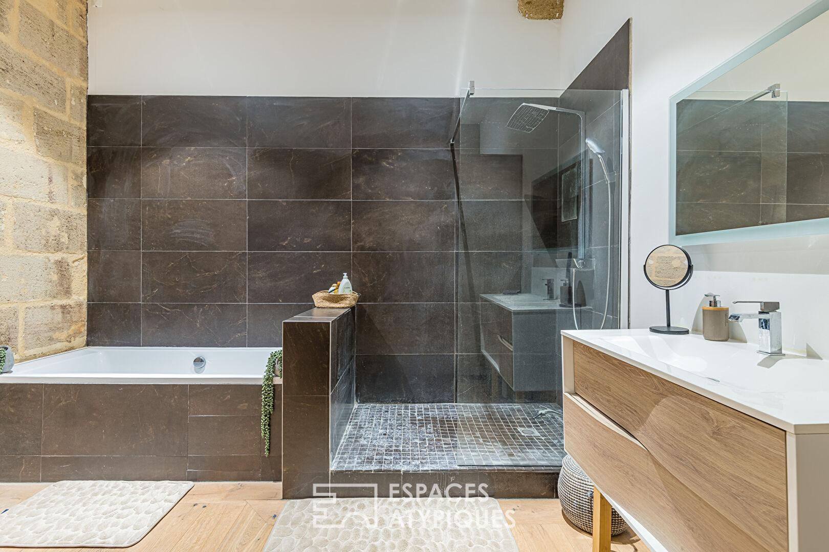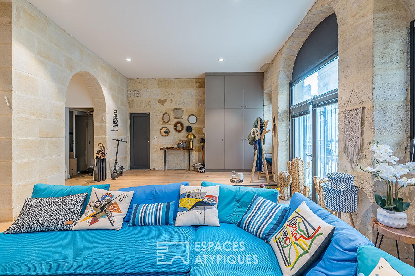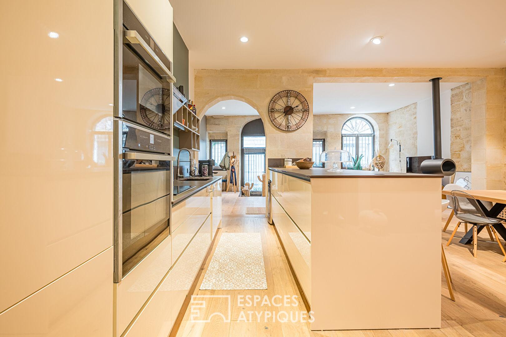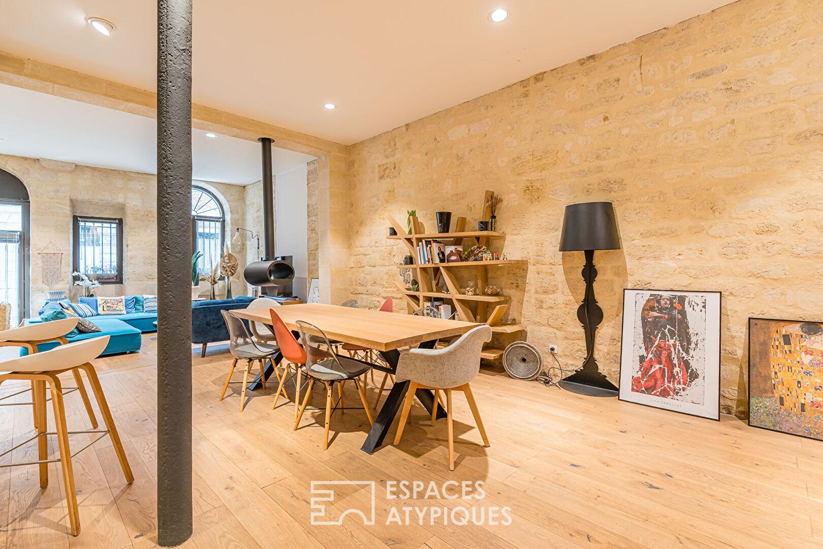 En plein coeur du quartier prisé des Chartrons, à deux pas de la rue Notre-Dame, ce loft en rez-de-chaussée de 120 m² Carrez, installé dans un ancien club de jazz, déploie un cachet unique et une atmosphère chaleureuse. Ce bien rare, entièrement de plain-pied, séduit par ses volumes généreux, son aménagement optimisé et le mélange harmonieux entre pierre apparente, éléments contemporains et touches industrielles.
