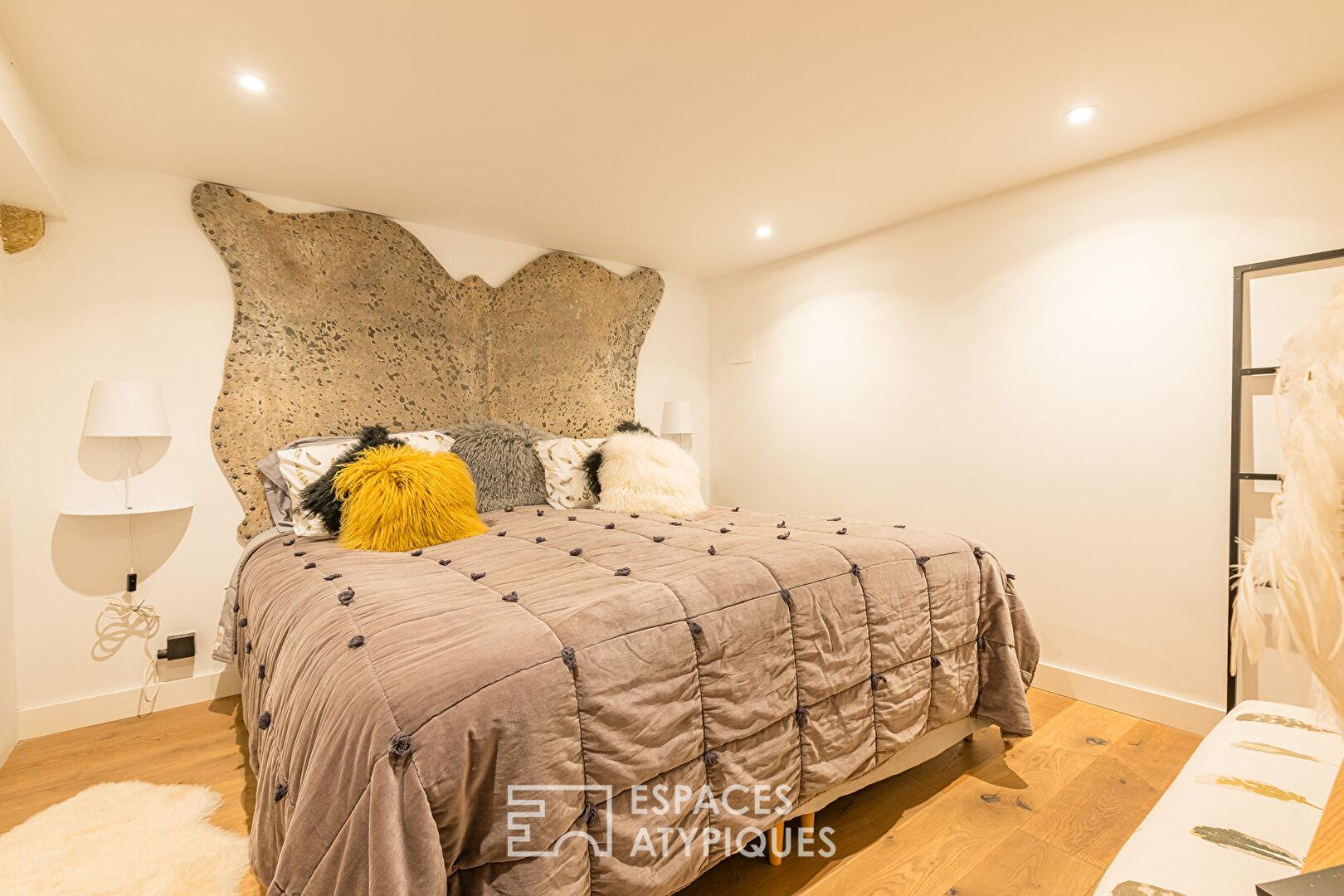Les espaces intérieurs s’articulent autour d’une vaste pièce de vie, sublimée par de grandes ouvertures cintrées et une belle hauteur sous plafond. Le séjour, prolongé par une salle à manger et une cuisine ouverte aménagée et équipée, invite à la convivialité. L’ensemble est structuré autour d’une cheminée à l’éthanol suspendue, apportant chaleur et identité à la pièce principale. Deux chambres complètent le bien, dont une en mezzanine, idéale pour un coin nuit cocooning ou un espace de travail inspirant. Les matériaux ont été soigneusement sélectionnés pour offrir confort et caractère : parquet massif, menuiseries métalliques, mobilier sur mesure et éléments décoratifs atypiques.