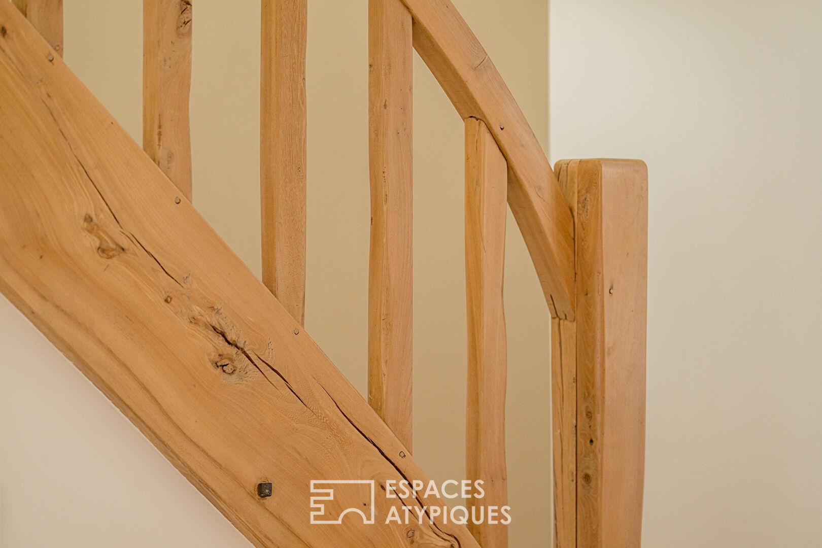 L’entrée, fonctionnelle, dispose d’un cellier de 7m2 muni de nombreux rangements intégrés. Un bel escalier en pierre mène à un premier niveau mettant en valeur un parquet en chêne massif à bâton rompu ainsi qu’une cheminée en pierre fonctionnelle, apportant chaleur et caractère à l’ensemble.