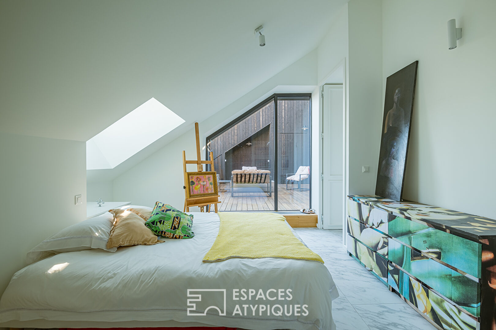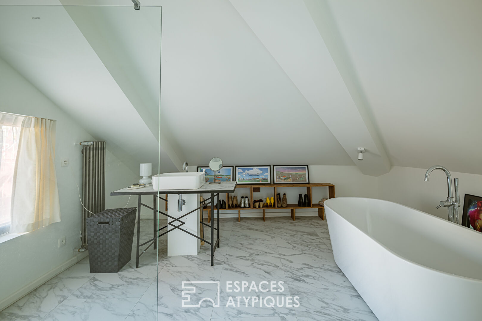 Le niveau principal abrite également une chambre parentale avec son dressing, ainsi qu’une salle de bains complète, comprenant à la fois une douche et une baignoire pour un maximum de confort. À l’étage, un palier dessert deux chambres supplémentaires, une salle d’eau moderne et un WC indépendant.