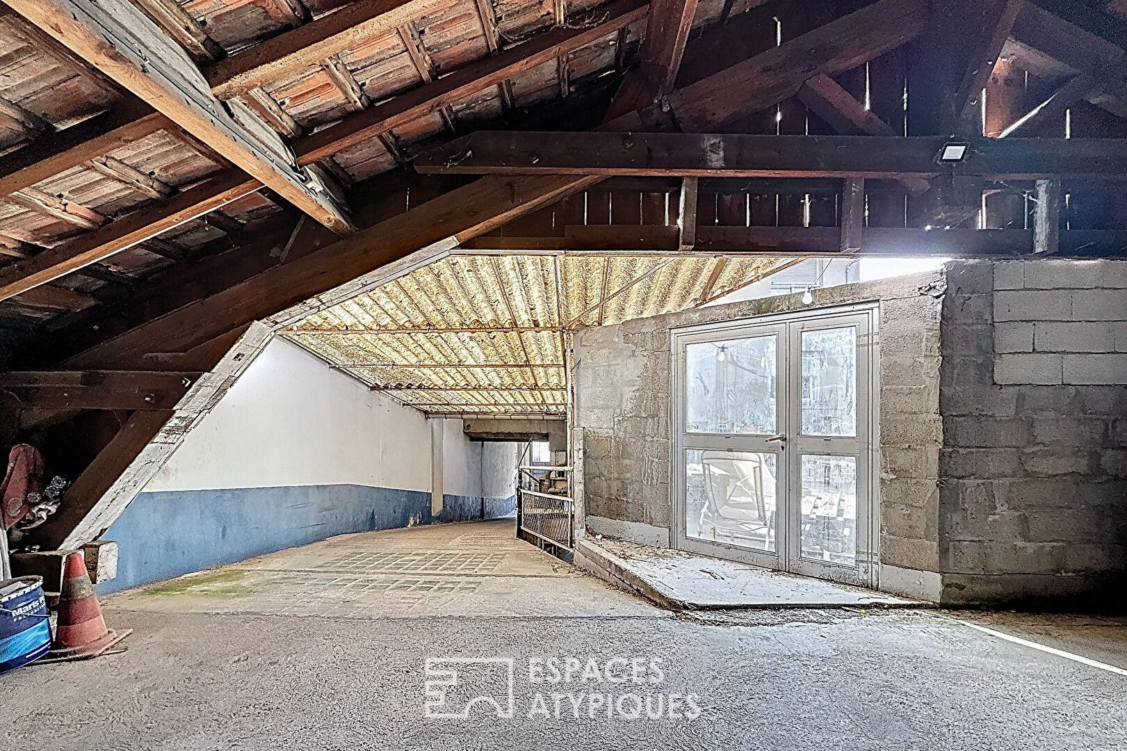 Accessible par une rampe en béton au caractère affirmé, ce deuxième et dernier niveau offre des volumes spectaculaires. Avec une emprise généreuse de 22,5 m de long par 10,8 m de large, l’espace est aujourd’hui une page blanche structurée par une charpente apparente en excellent état, apportant un cachet authentique et une hauteur sous plafond propice aux projets les plus audacieux.