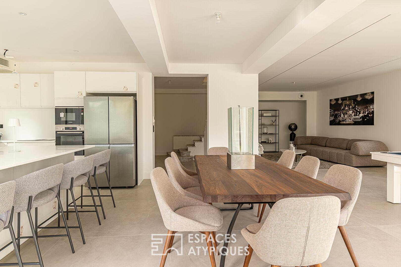 En rez-de-jardin, la maison révèle un spectaculaire espace de réception d’environ 80 m² réunissant salon, salle à manger et cuisine ouverte.