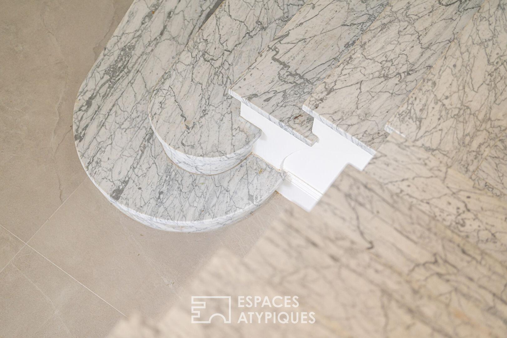 À l’abri des regards, le jardin paysager invite à la détente avec sa terrasse conviviale, sa piscine chauffée et sa pergola, véritable prolongement des espaces de vie.
