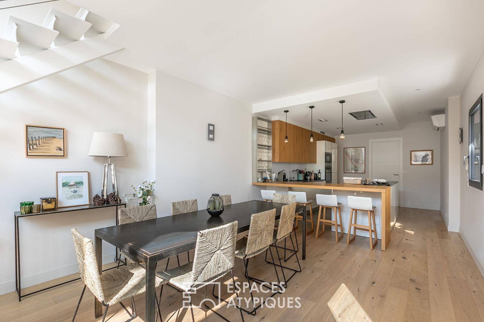 Au coeur d’Arcachon, à seulement quelques pas de la plage, ce loft de 147m² incarne une vision contemporaine de l’art de vivre en bord de mer. Entièrement repensé en 2020, ce bien singulier conjugue volumes généreux, lumière omniprésente et lignes épurées.