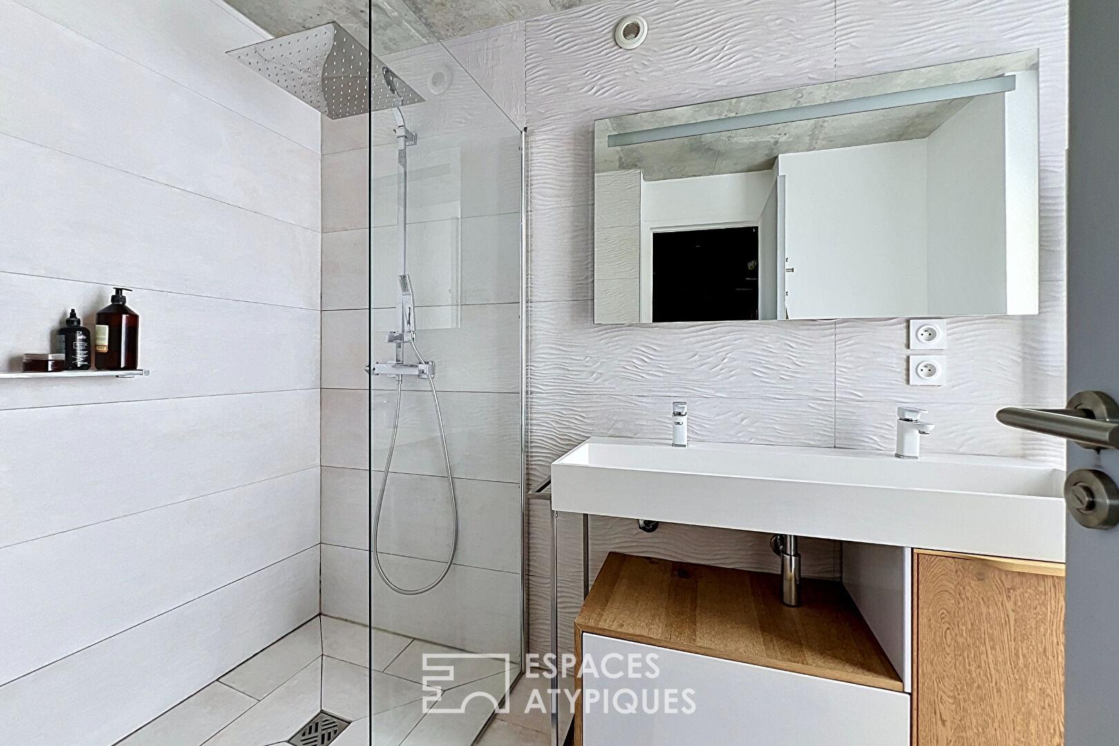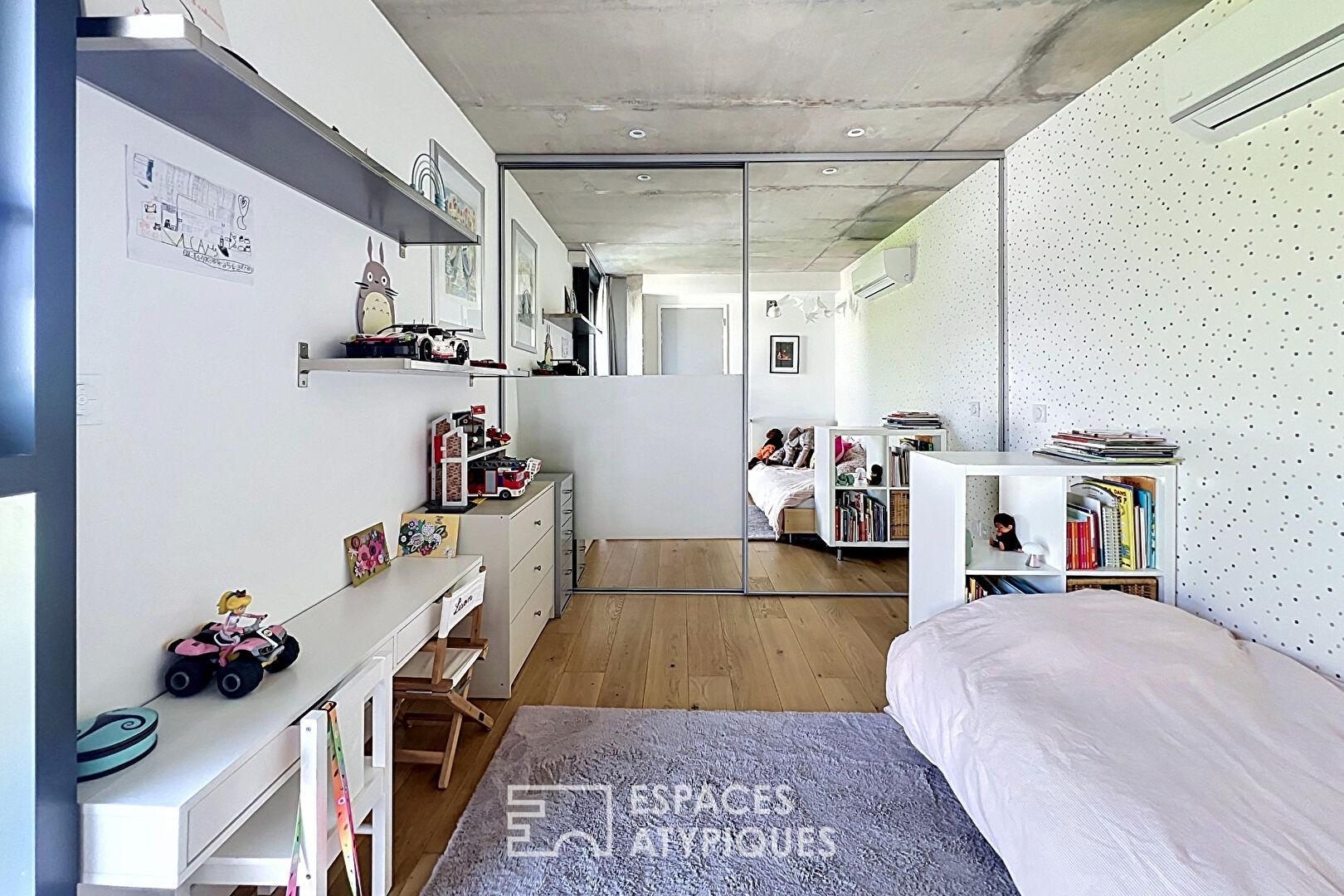 Un escalier en béton mène au premier étage, où prennent place deux chambres, dont une avec balcon, un espace bureau sur le palier ainsi qu’une grande salle de bains intégrant un espace buanderie.