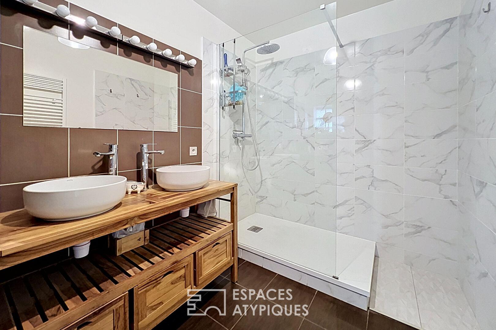 Au premier étage, un palier ouvert pouvant accueillir un espace bureau dessert une chambre, une salle d’eau avec douche à l’italienne et WC, ainsi qu’un dressing.