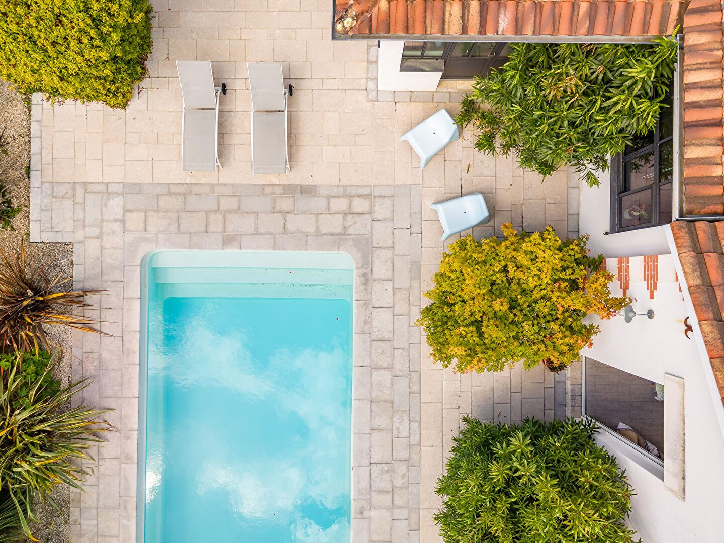 A l’extérieur, un jardin paysager soigneusement orchestré. Oliviers, palmiers et lauriers-roses composent un décor à l’atmosphère méditerranéenne, préservant intimité et sérénité. La piscine s’inscrit naturellement dans cet écrin végétal, prolongée par une terrasse élégante accueillant une cuisine d’été entièrement équipée ? un véritable lieu de vie à ciel ouvert.