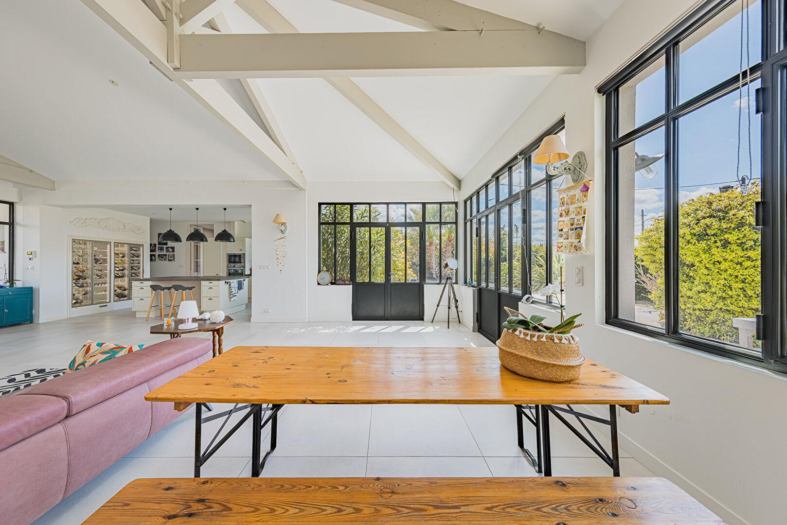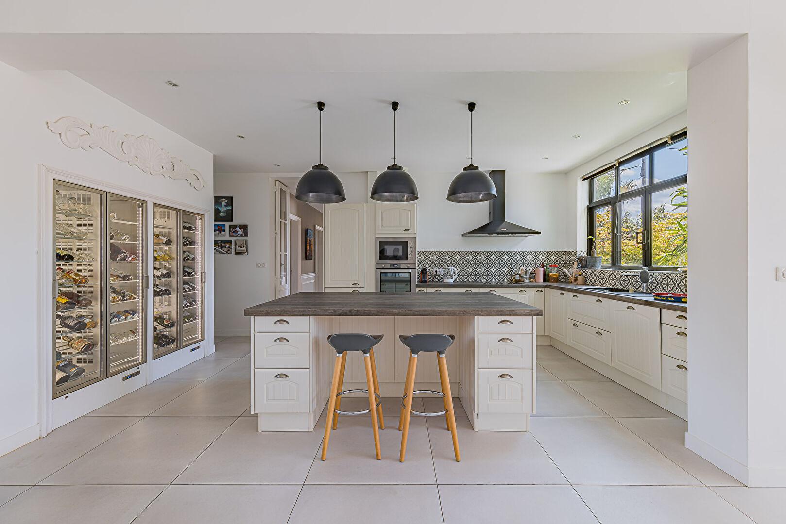 Dès l’entrée, le regard est capté par une vaste pièce de vie, où la hauteur sous plafond et les larges ouvertures dessinent un espace baigné de lumière résolument ouvert vers l’extérieur. La cuisine, parfaitement intégrée et équipée, prolonge cette harmonie avec discrétion et raffinement. Véritable élément signature, une cave à vin vitrée s’impose comme une oeuvre architecturale à part entière, sublimant l’espace de réception et invitant à des moments de convivialité rares.