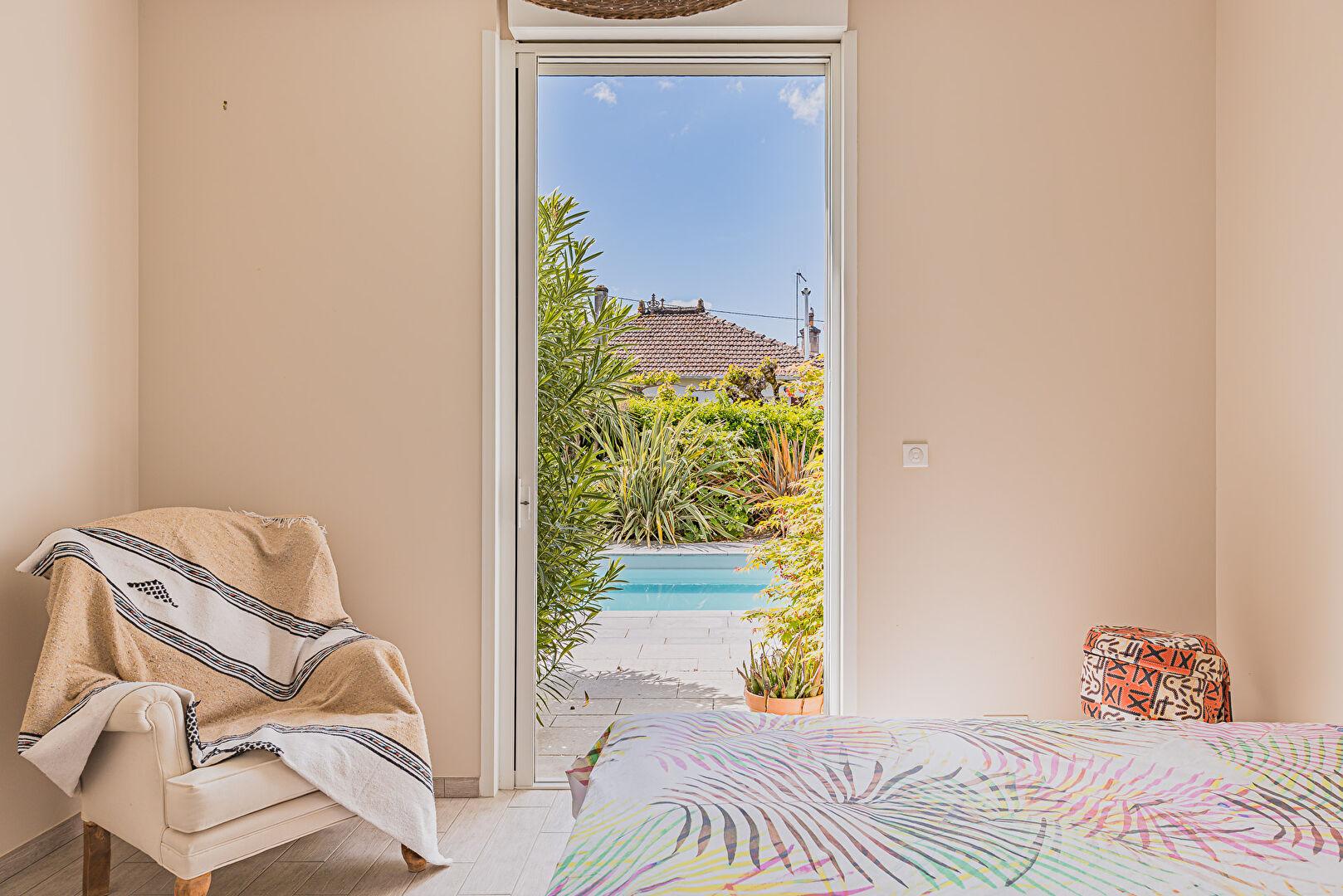 La suite parentale, conçue comme un refuge intime, offre une expérience sensorielle unique. Dotée d’une baignoire et d’une baie à galandage, elle s’efface totalement pour laisser place à une ouverture directe sur le jardin et la piscine. Deux chambres supplémentaires viennent compléter ce bien de plain-pied, pensé pour un confort absolu.