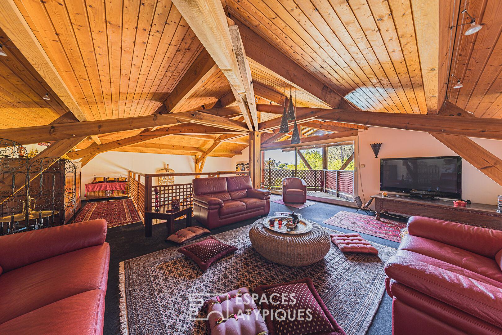 L’espace nuit se compose de quatre chambres, dont une suite parentale. Une vaste mezzanine surplombe le séjour, offrant un cadre idéal pour un bureau ou un atelier. Si la maison est immédiatement habitable, elle constitue également une belle opportunité de réinterprétation contemporaine. Un rafraîchissement permettrait d’en révéler tout le potentiel et de sublimer son architecture.