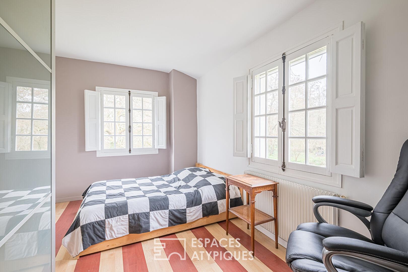 À l’étage, l’espace nuit se compose de trois chambres ainsi qu’une quatrième aménagée avec dressing et une salle d’eau avec douche à l’italienne et double vasque. Une salle de bain familiale et un WC desservent ce plateau. Chaque pièce profite de vues dégagées sur le bois environnant et sur la rivière traversante, conférant à l’ensemble une atmosphère apaisante et immersive. Les anciennes turbines, aujourd’hui non exploitées, témoignent de l’histoire du moulin.