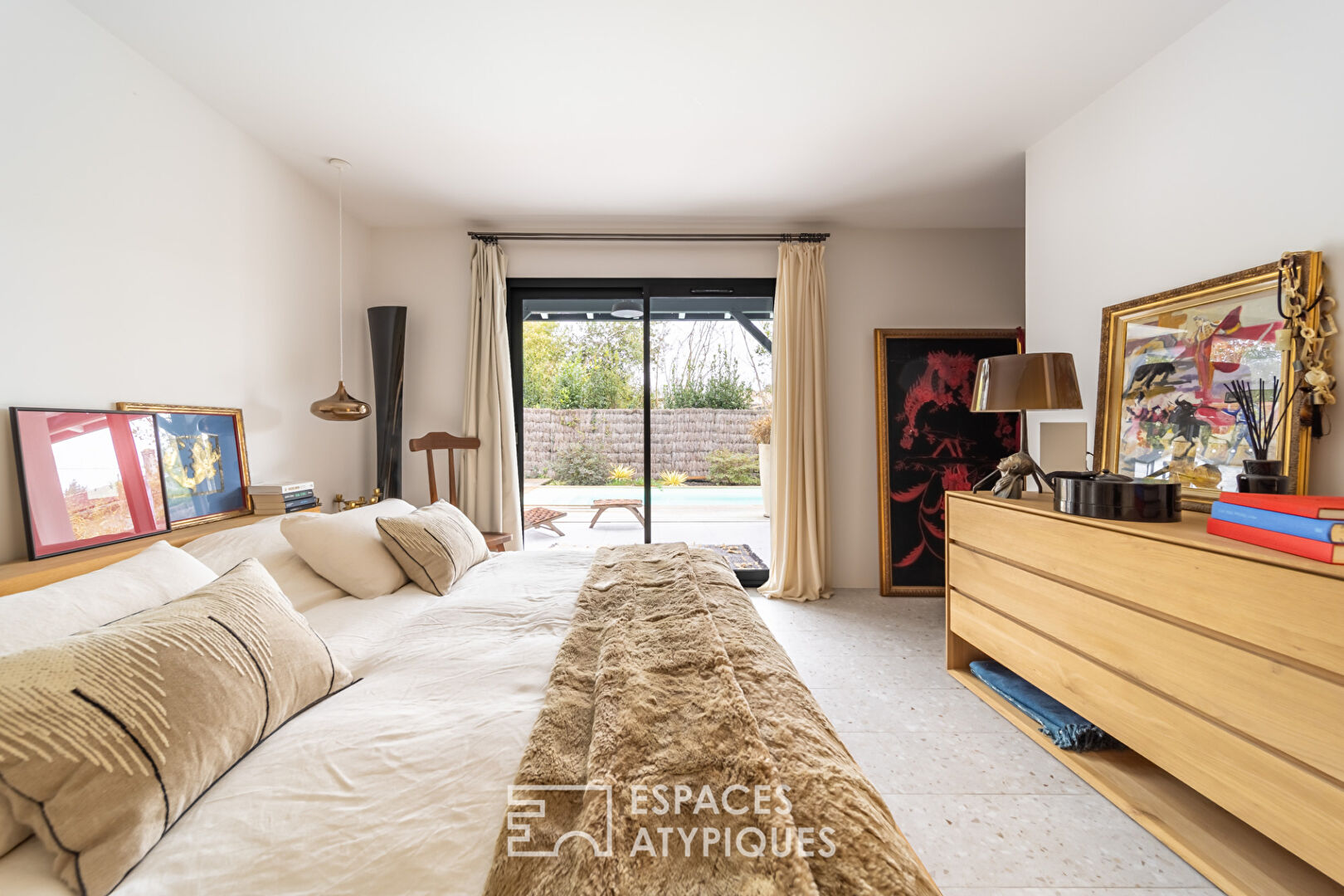 La cuisine haut de gamme, entièrement équipée, s’inscrit dans cette même harmonie et donne accès à une terrasse en terrazzo véritable, créant ainsi une continuité audacieuse entre les espaces de vie intérieurs et extérieurs.