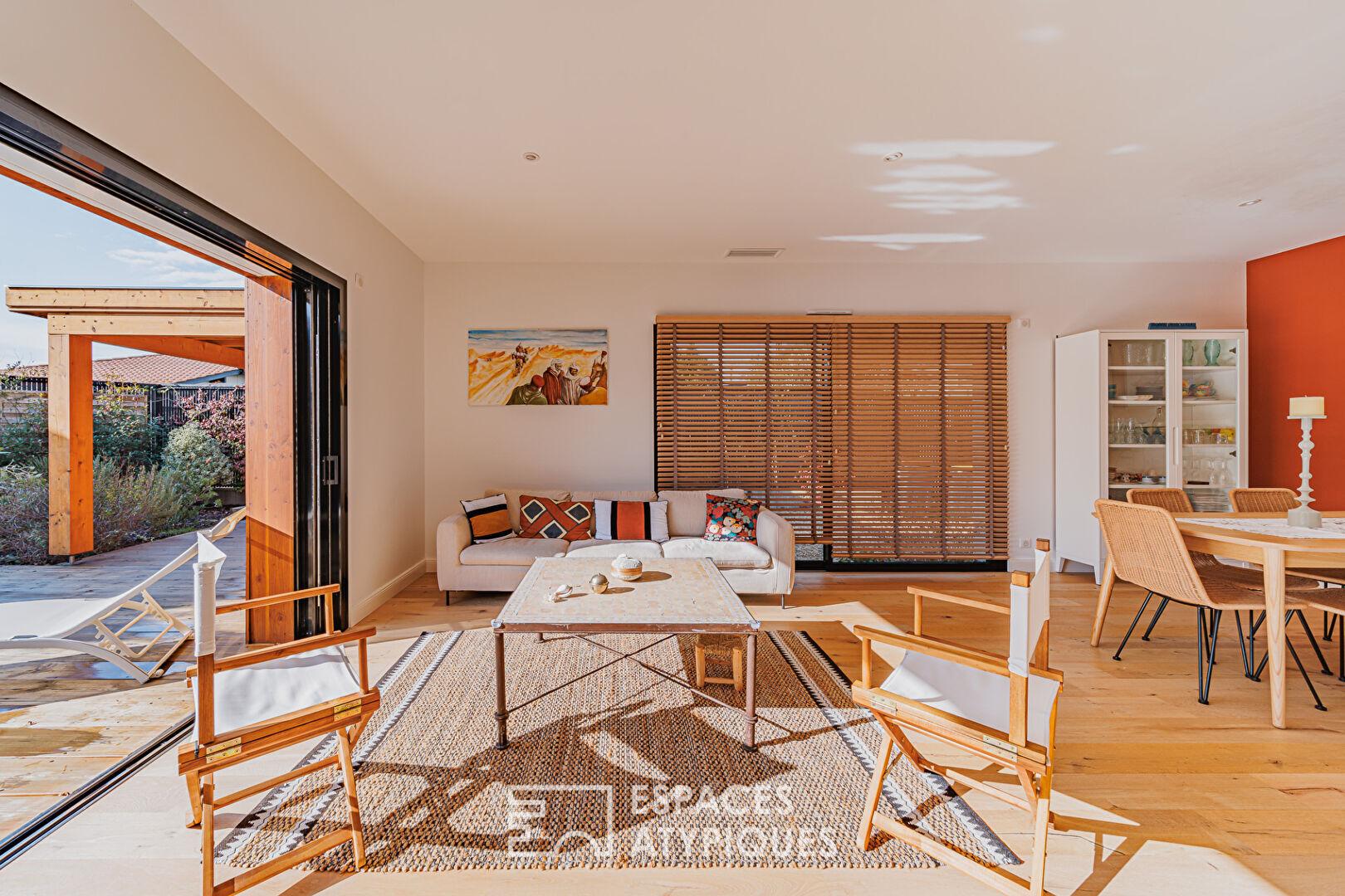 Située en hyper centre de La Teste-de-Buch, à quelques pas du marché et des commodités, cette charmante maison de plain-pied de 114m2 construite en 2022 prend place sur un terrain de 360m2 avec piscine chauffée.