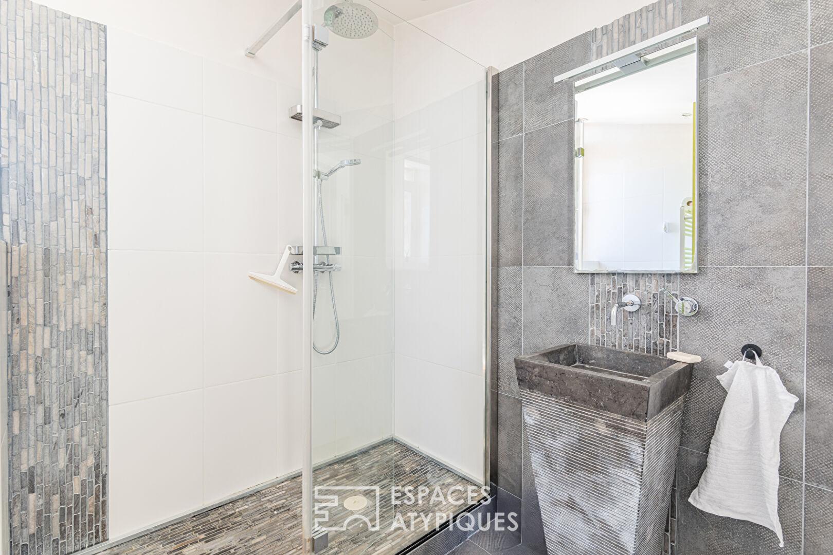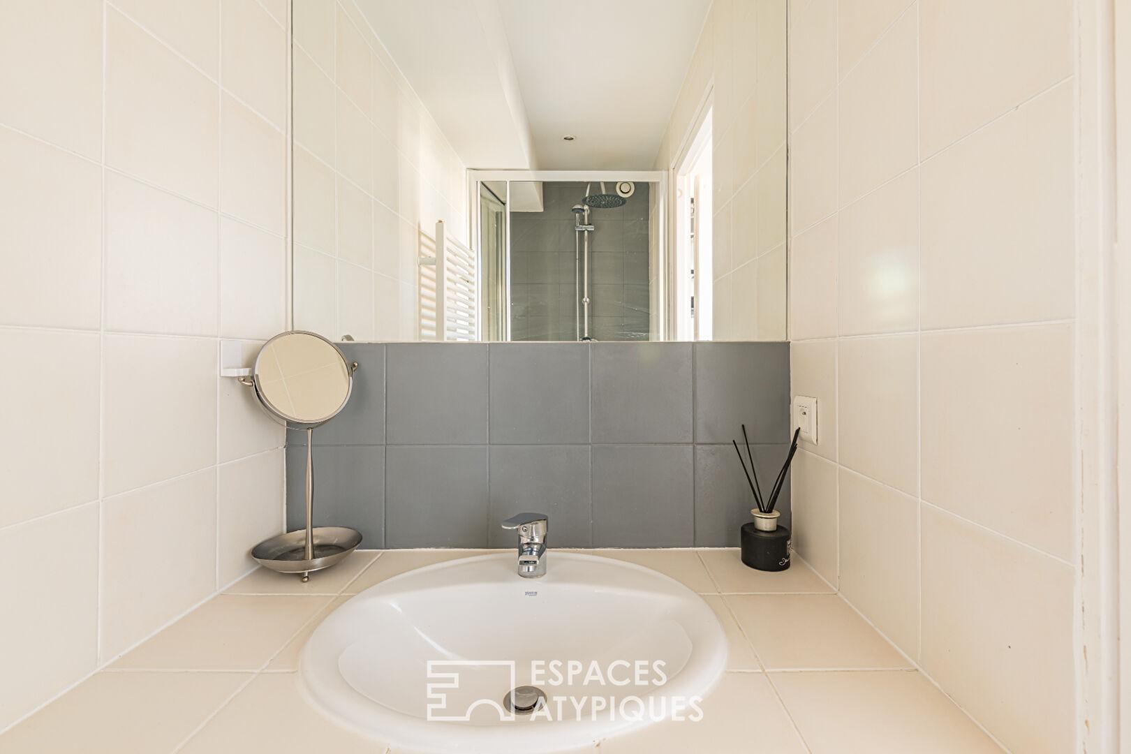 Dès l’entrée, l’espace s’ouvre sur un salon-salle à manger prolongé par une cuisine avec îlot, offrant un accès direct à une véranda climatisée donnant sur une cour intérieure, à l’abri des regards, créant ainsi un espace de vie supplémentaire. Un WC indépendant, une chambre avec salle d’eau ainsi que des rangements complètent ce premier niveau.