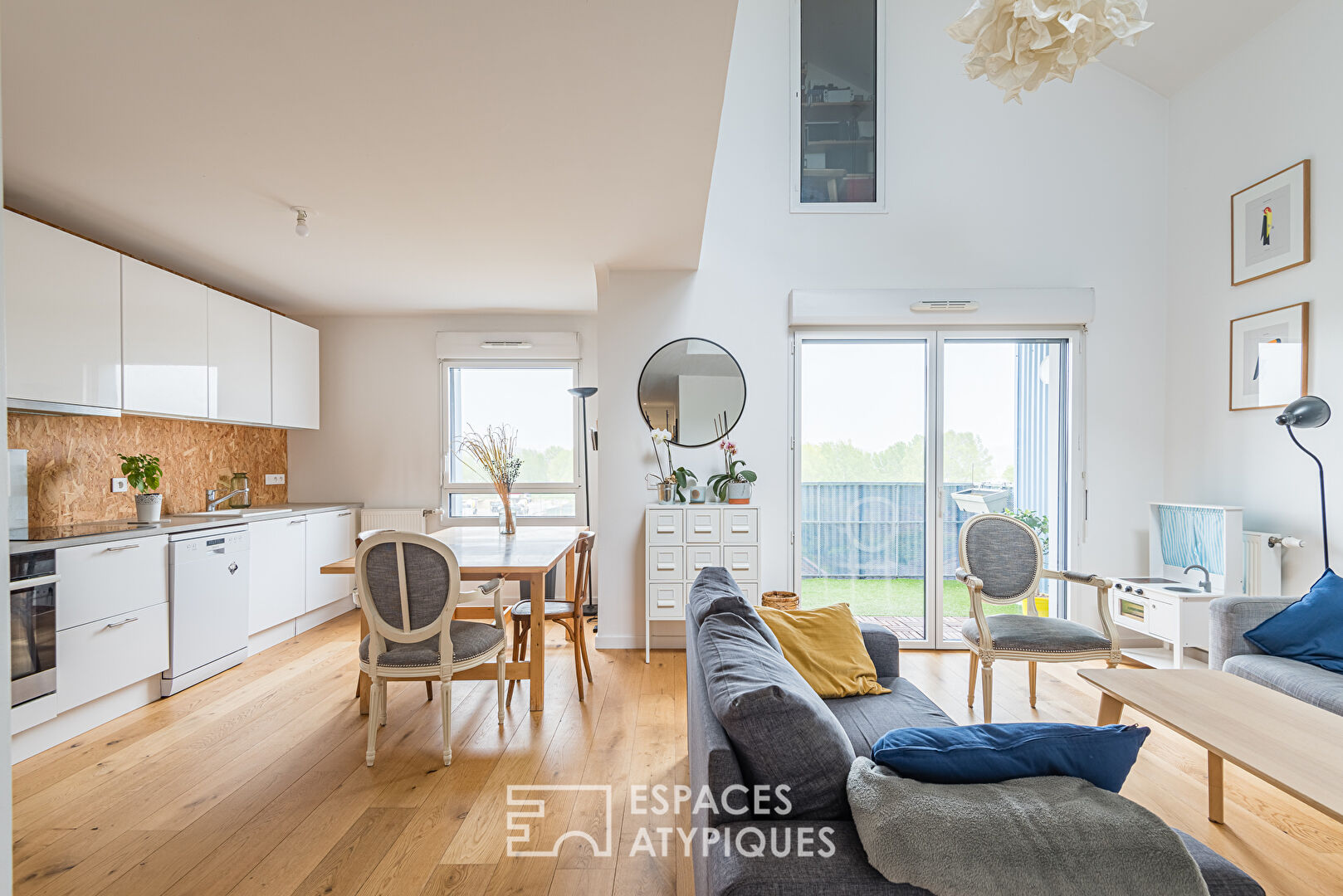 Végétation verticale, toiture shed, espaces partagés et allées transversales font de ce logement son originalité. À proximité immédiate du tramway, des commerces et des écoles.