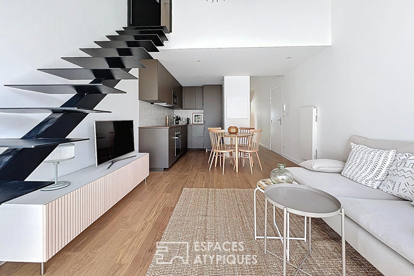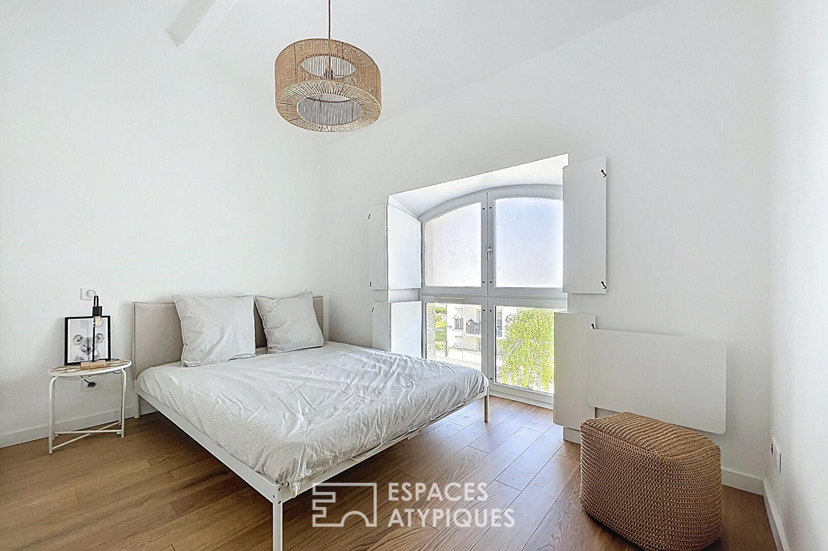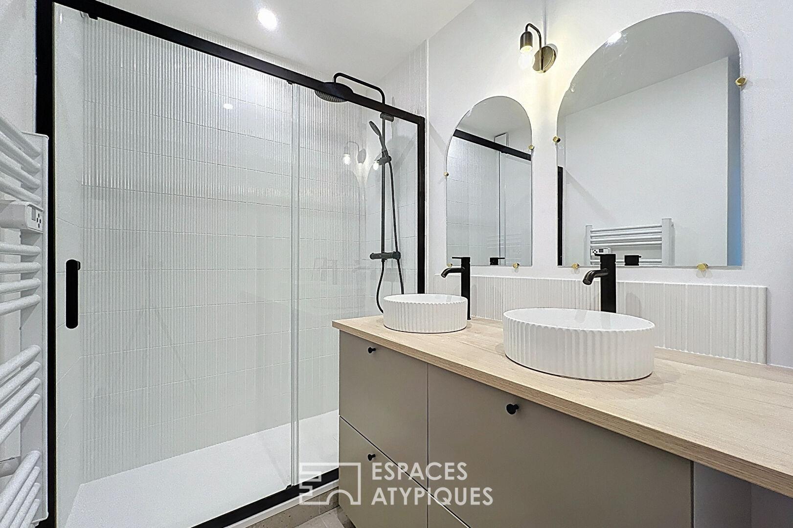 L’appartement dispose de deux chambres, dont une à l’étage, offrant calme et intimité. La rénovation récente met en valeur chaque volume tout en optimisant les rangements. La salle d’eau contemporaine, équipée d’une douche et de doubles vasques, complète cet ensemble.