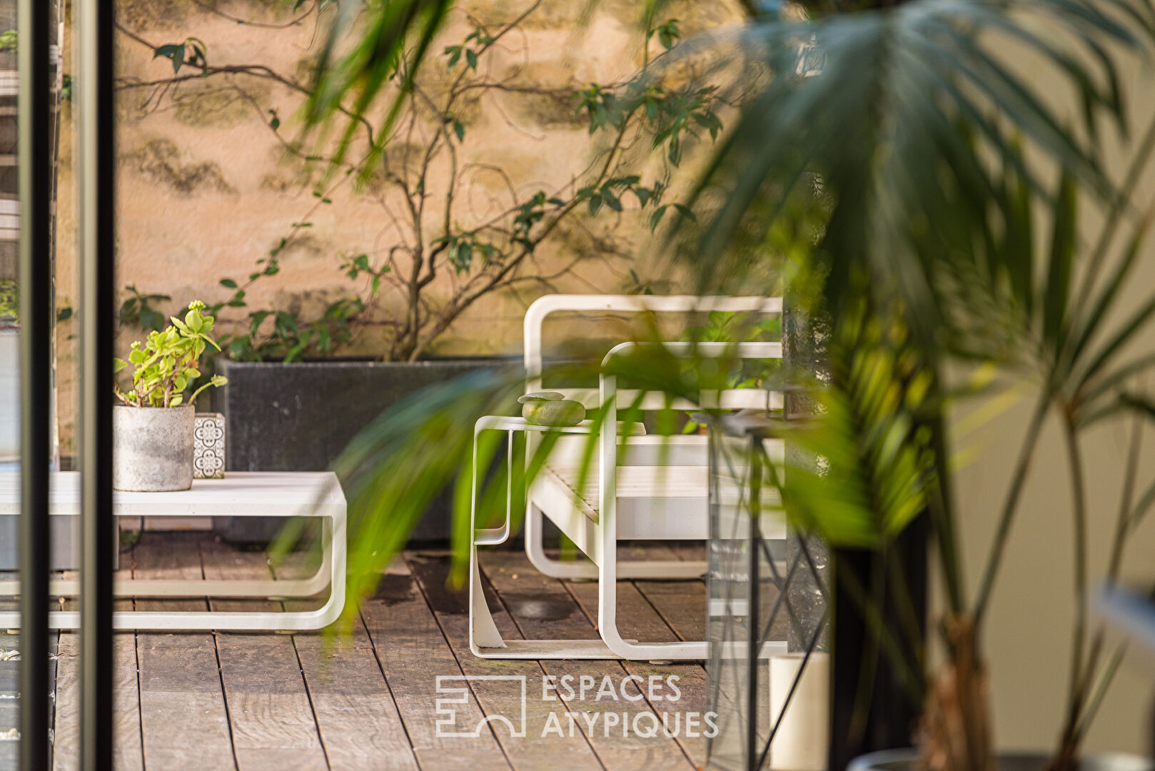 Proche de la Place Saint Martial, aux Chartrons, ce loft en pleine propriété offre 170m2 habitables sur 2 niveaux, avec un double garage et deux terrasses avec piscine.