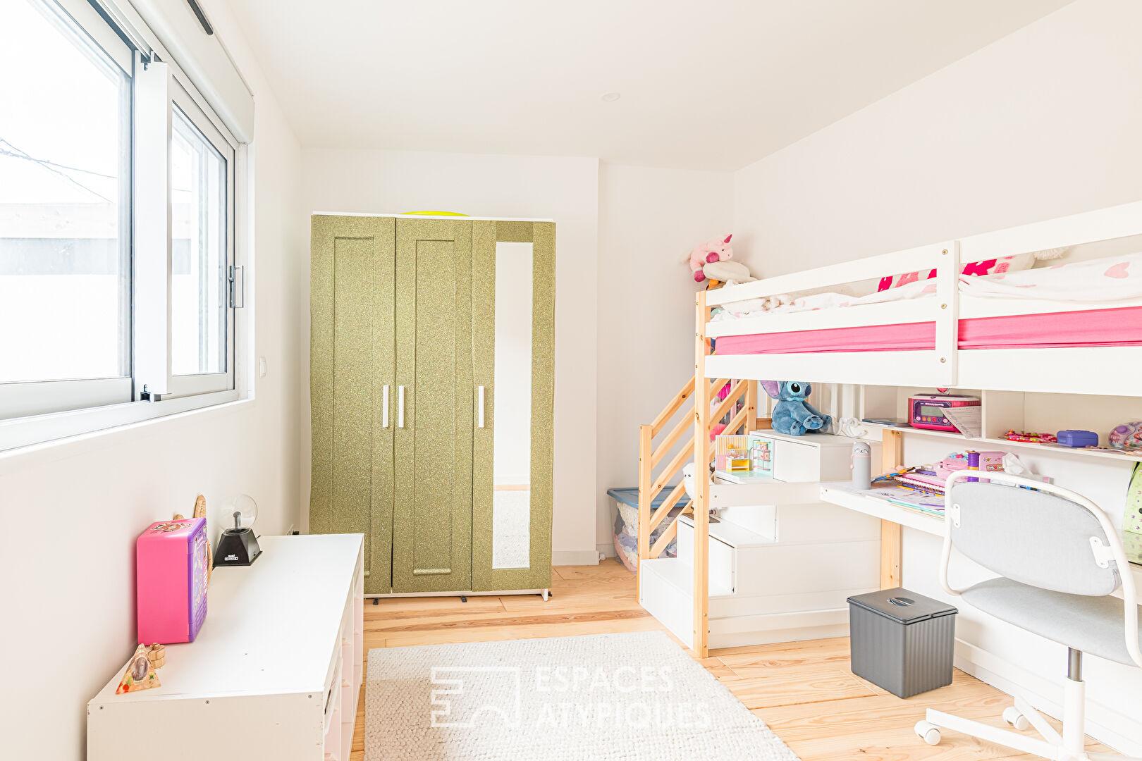 À l’étage, un palier dessert trois chambres avec rangements qui se partagent une salle d’eau. Une suite parentale complète ce niveau, avec dressing et salle d’eau attenante, pensée comme un espace à part, confortable et fonctionnel.