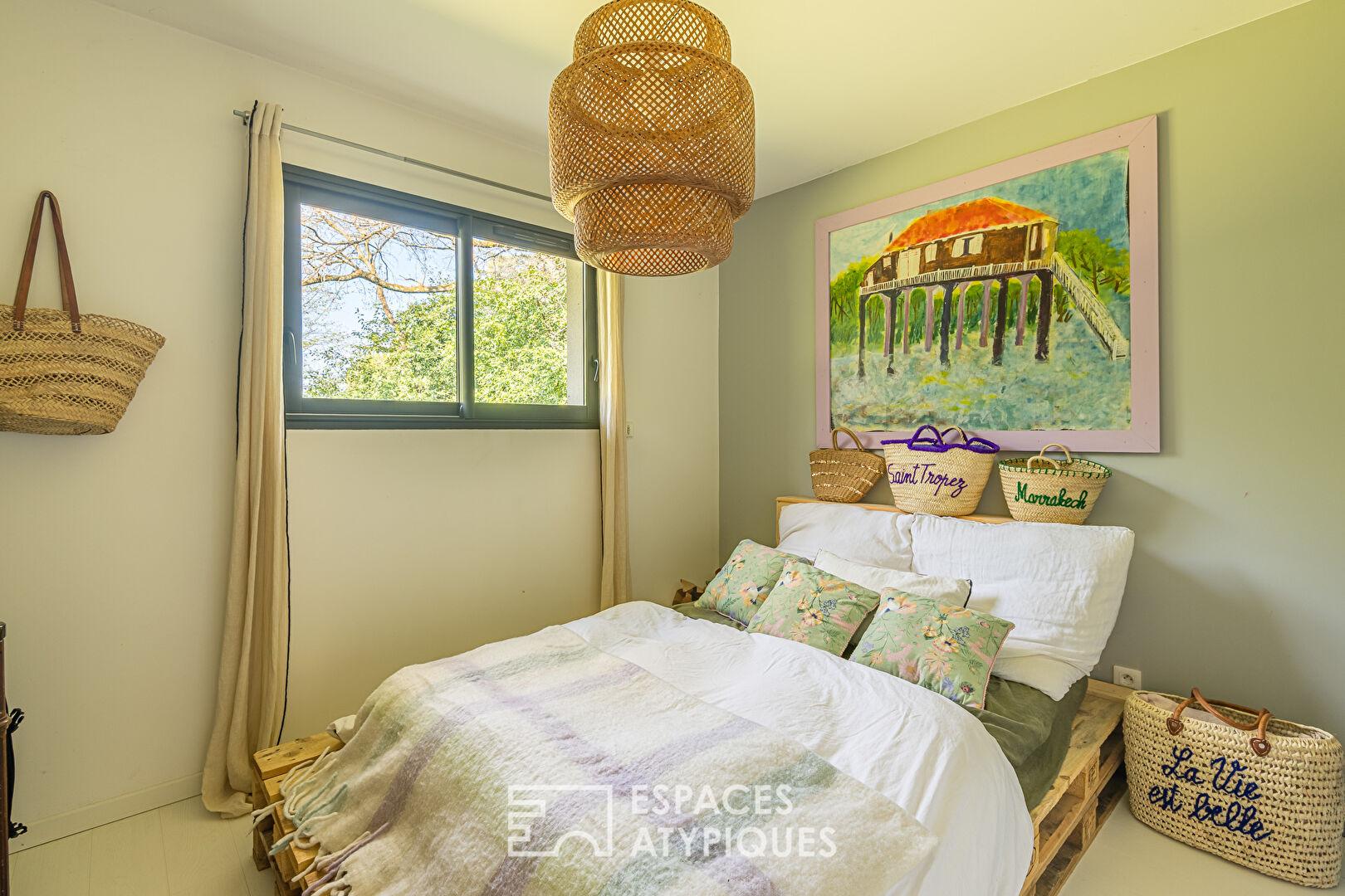Les extérieurs prolongent naturellement les volumes intérieurs et composent un véritable lieu de vie : piscine avec plage de bronzage, bar d’été, espaces lounge structurent les différents espaces de convivialité. Plusieurs stationnements extérieurs et un grand garage pouvant accueillir un véhicule offrent des usages complémentaires. L’ensemble profite d’une vue particulièrement agréable et dégagée sur la forêt dans un cadre calme tout en restant proche des commodités et des accès vers Bordeaux.