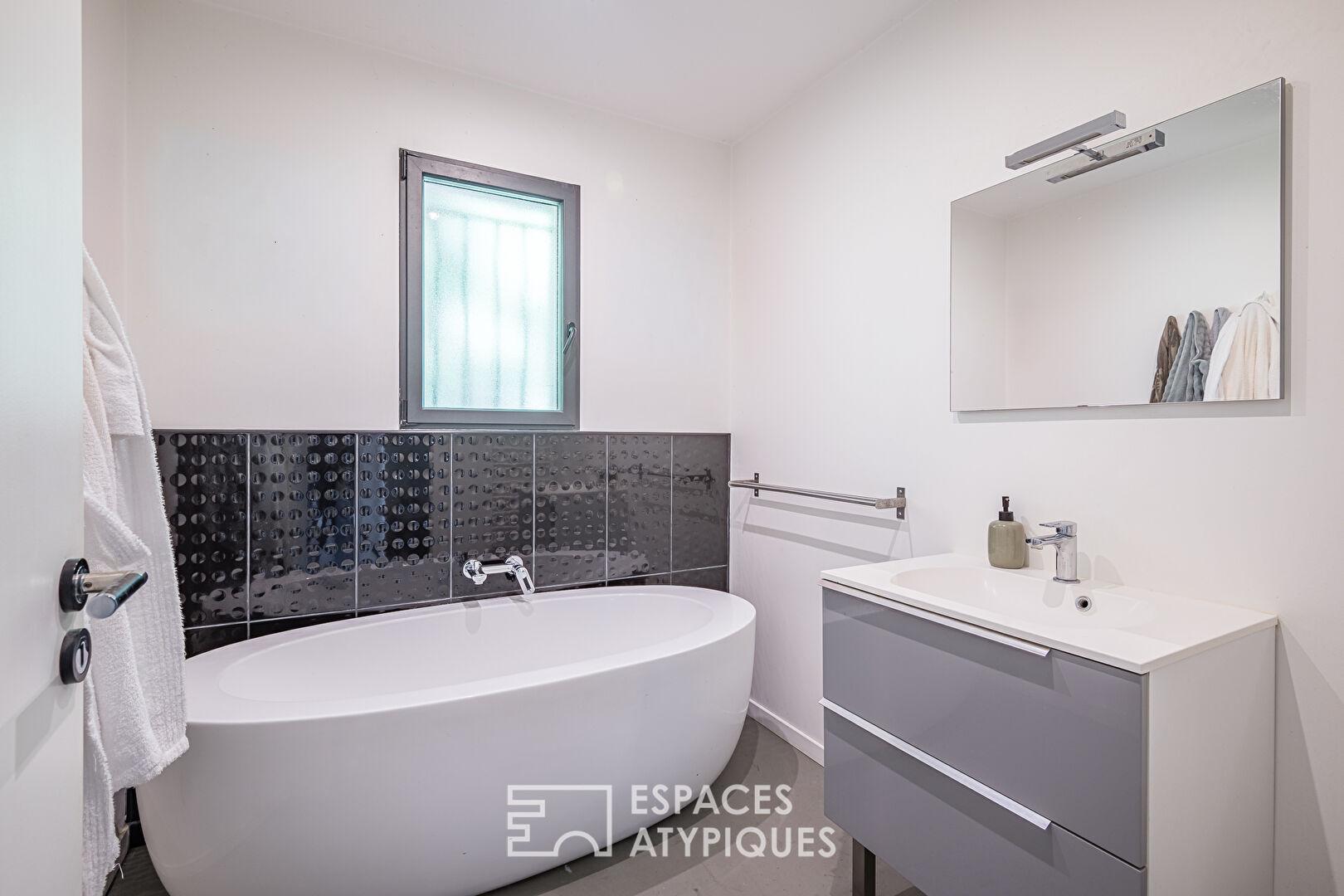 L’espace nuit propose quatre chambres dont une suite parentale avec dressing et salle d’eau. Une salle de bain moderne avec douche et baignoire complète l’ensemble.