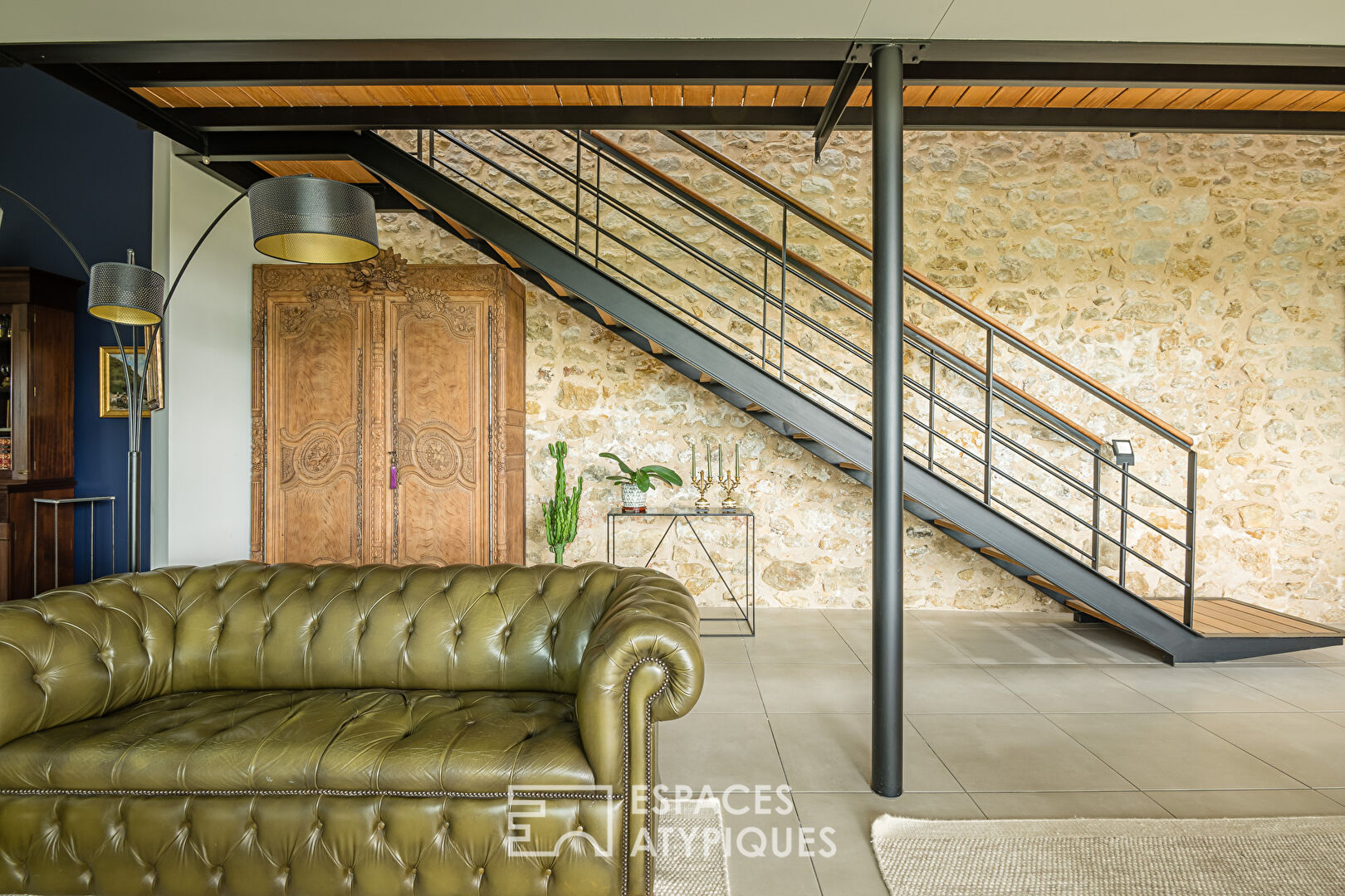 Avec ses 310 m² de surface, décorée avec goût et raffinement, la maison offre des espaces généreux. Dès l’entrée spacieuse, un dressing et une cave à vin annoncent le ton. Un long couloir, ingénieusement aménagé avec des rangements discrets, dessert d’un côté une jolie chambre, une salle d’eau et des toilettes. De l’autre côté, on accède à la pièce de vie, un vaste espace de 90 m² au style loft, baigné de lumière et ouvert sur la terrasse. La salle à manger et la cuisine moderne, entièrement équipée, se partagent cet espace convivial. Au fond de ce rez-de-chaussée, un second salon intime, au charme feutré, dévoile un magnifique toit cathédrale.