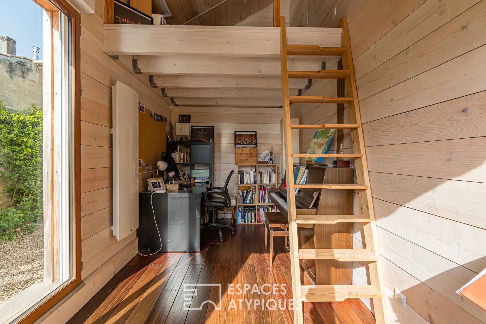 À l’extérieur, la spacieuse terrasse en bois constitue un véritable espace de vie, prolongée par une piscine chauffée propice à la détente. Une dépendance récente en bois accueille un espace bureau ainsi qu’une mezzanine pouvant faire office de couchage d’appoint, idéale pour recevoir ou télétravailler.