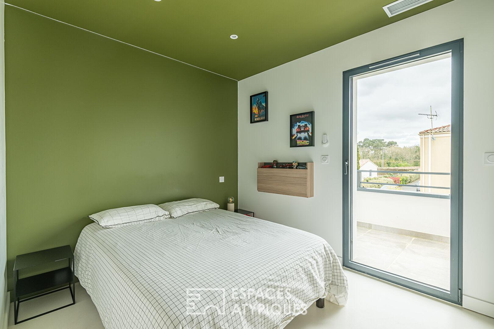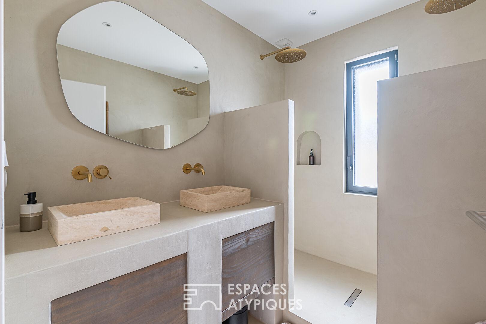 À l’étage, l’espace nuit se compose de trois chambres, dont une suite parentale avec dressing et salle d’eau privative équipée d’une double douche.Une salle de bain moderne et un WC complète ce niveau. Les chambres s’ouvrent sur un balcon filant, apportant lumière et prolongement extérieur à chaque espace.