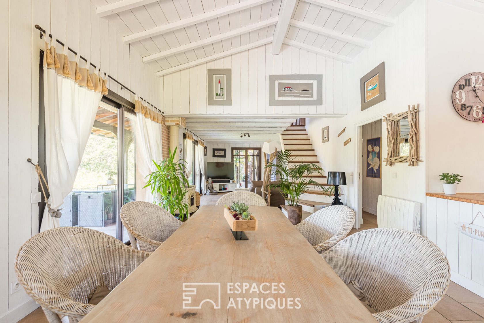 Faisant face au Domaine de Gravayron et au bassin d’Arcachon, sans aucun vis à vis, cette charmante Villa de 131 m2 habitable avec sa dépendance aménagée de 25 m2 vous séduira par son architecture bois typique du Bassin d’Arcachon et son emplacement exclusif.