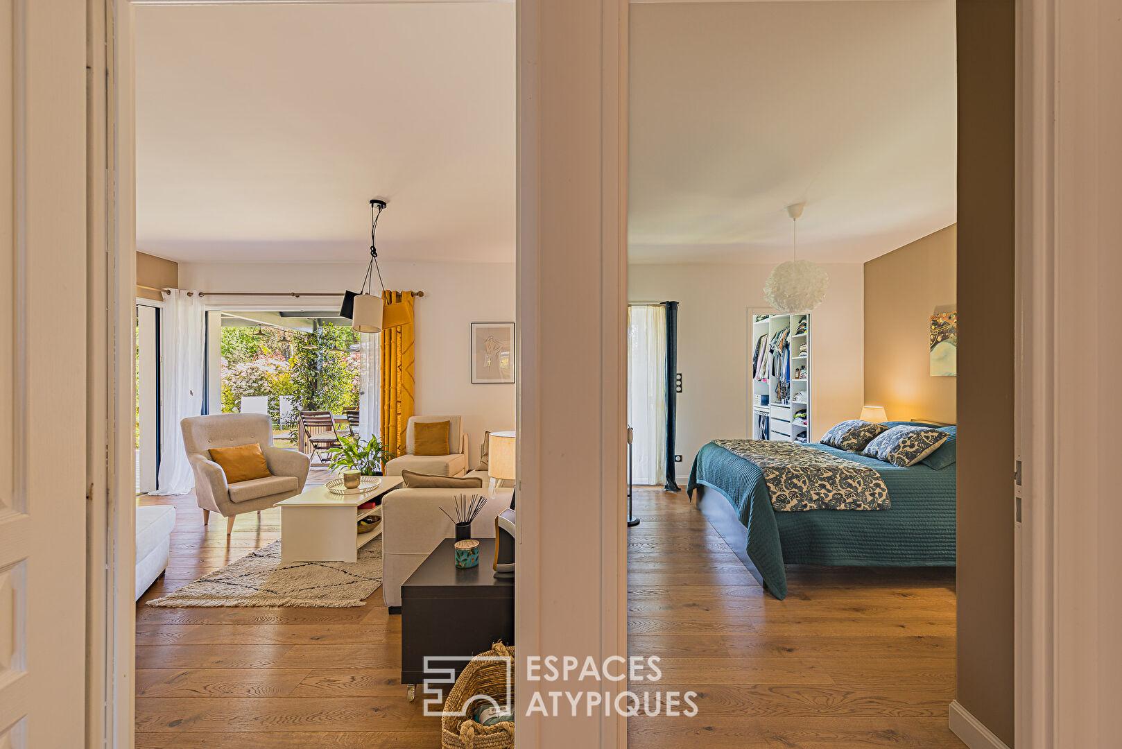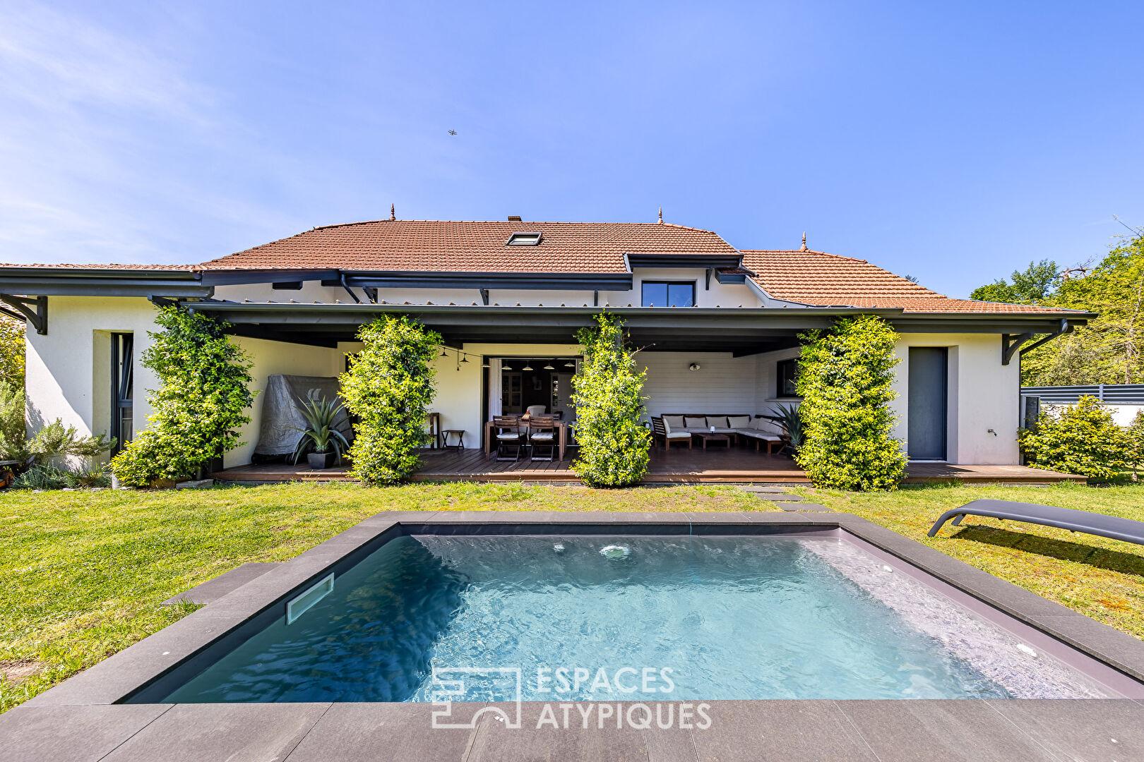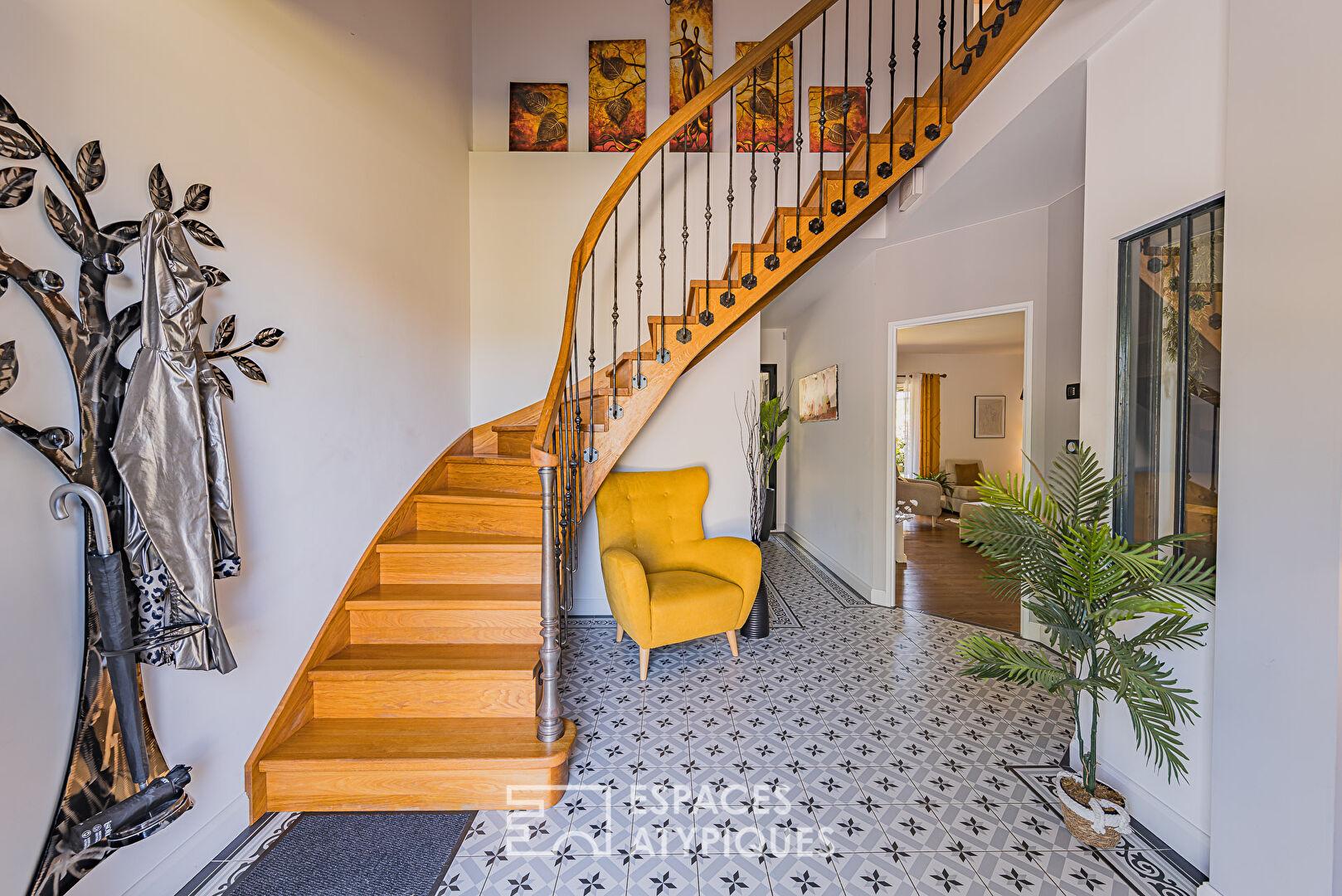 Dès l’entrée, le ton est donné : briquettes structurelles, carreaux de ciment graphiques et escalier en bois massif composent une signature esthétique forte. La cuisine, pensée comme un espace de réception, s’ouvre sur un salon chaleureux prolongé par une vaste terrasse couverte, créant une continuité fluide entre intérieur et extérieur. Le jardin paysager, agrémenté d’un bassin de détente, offre un cadre intime et apaisant.