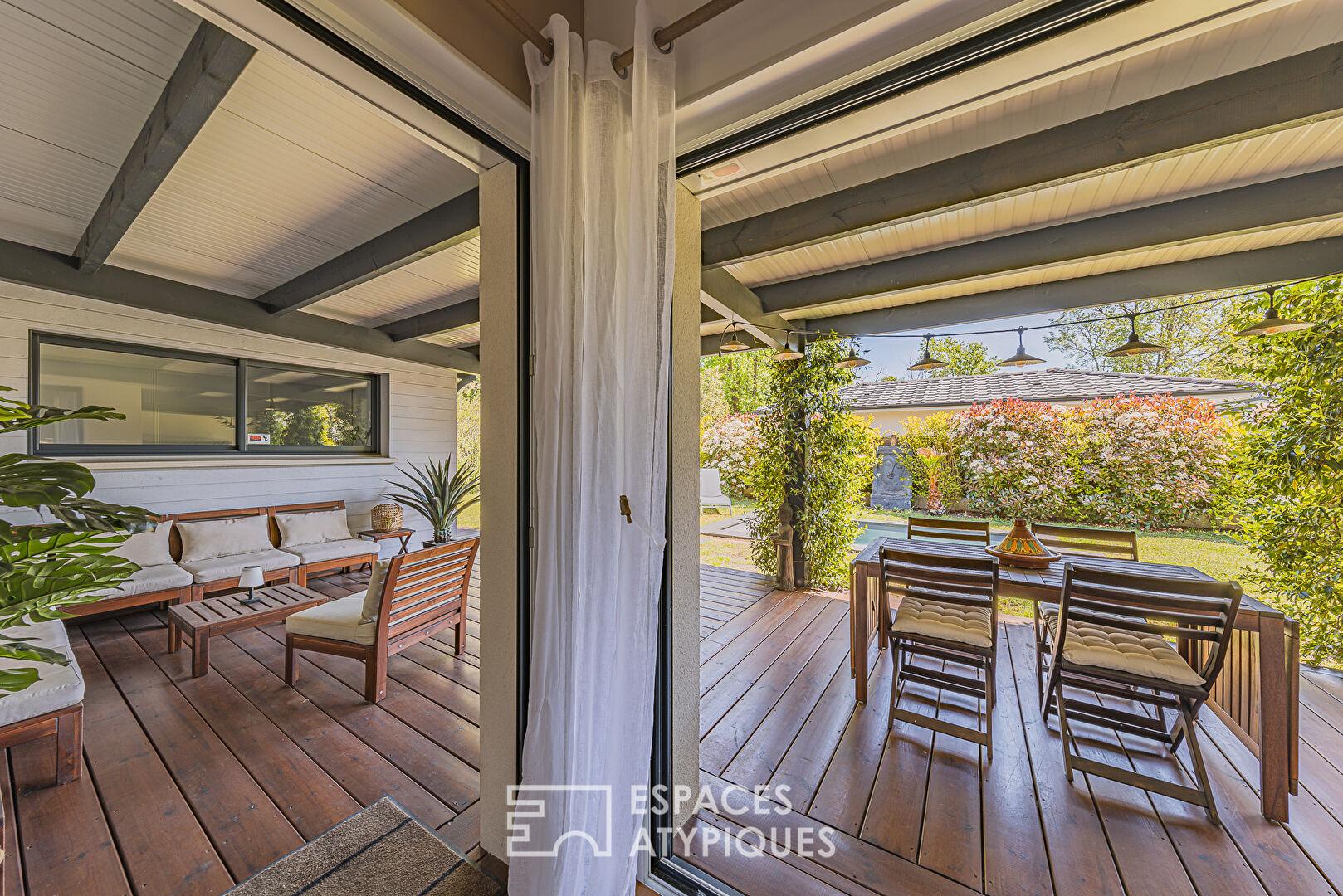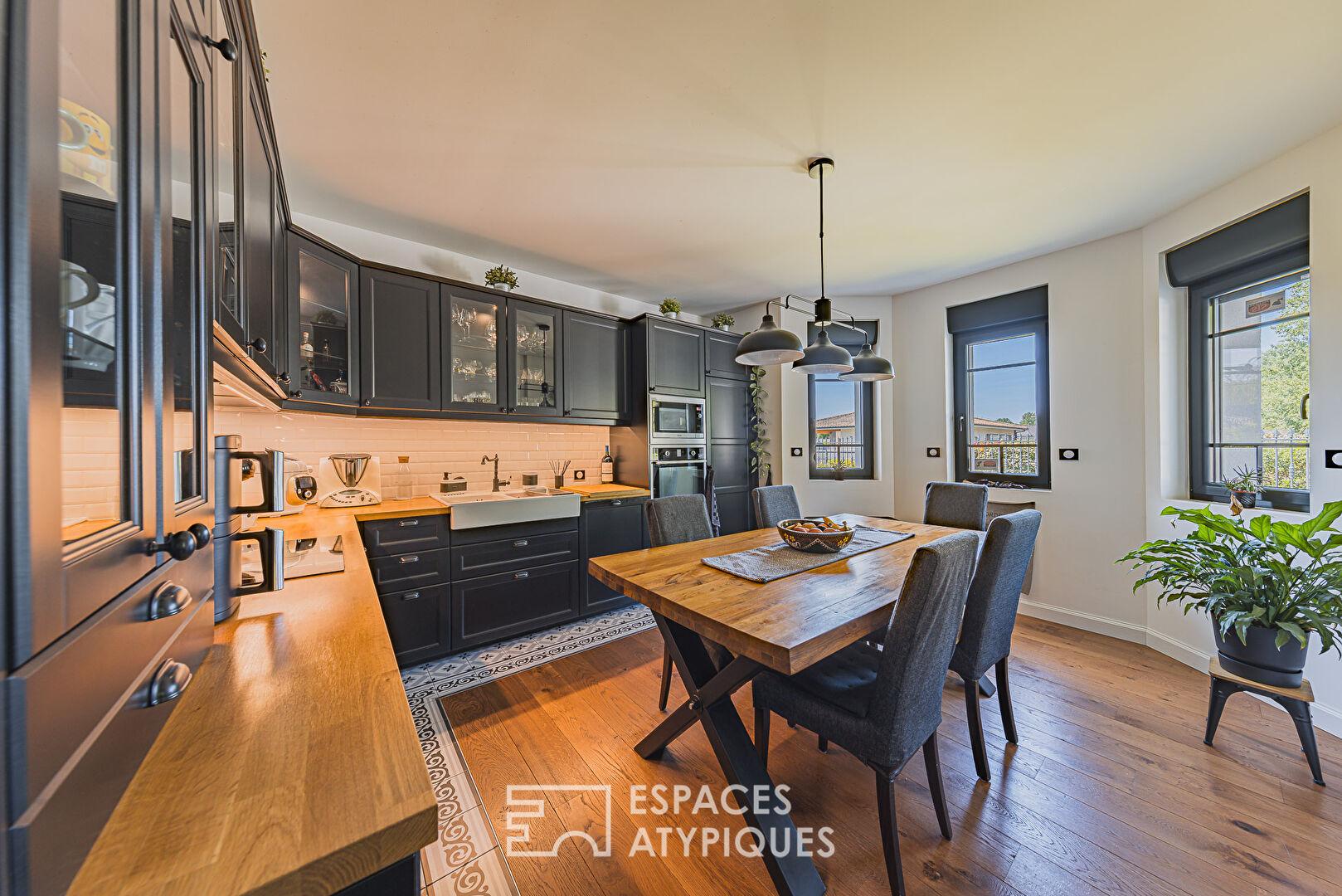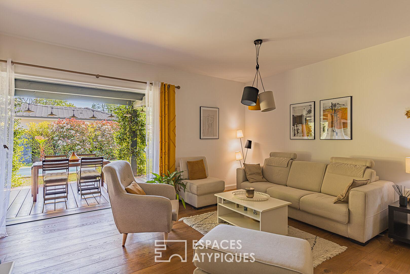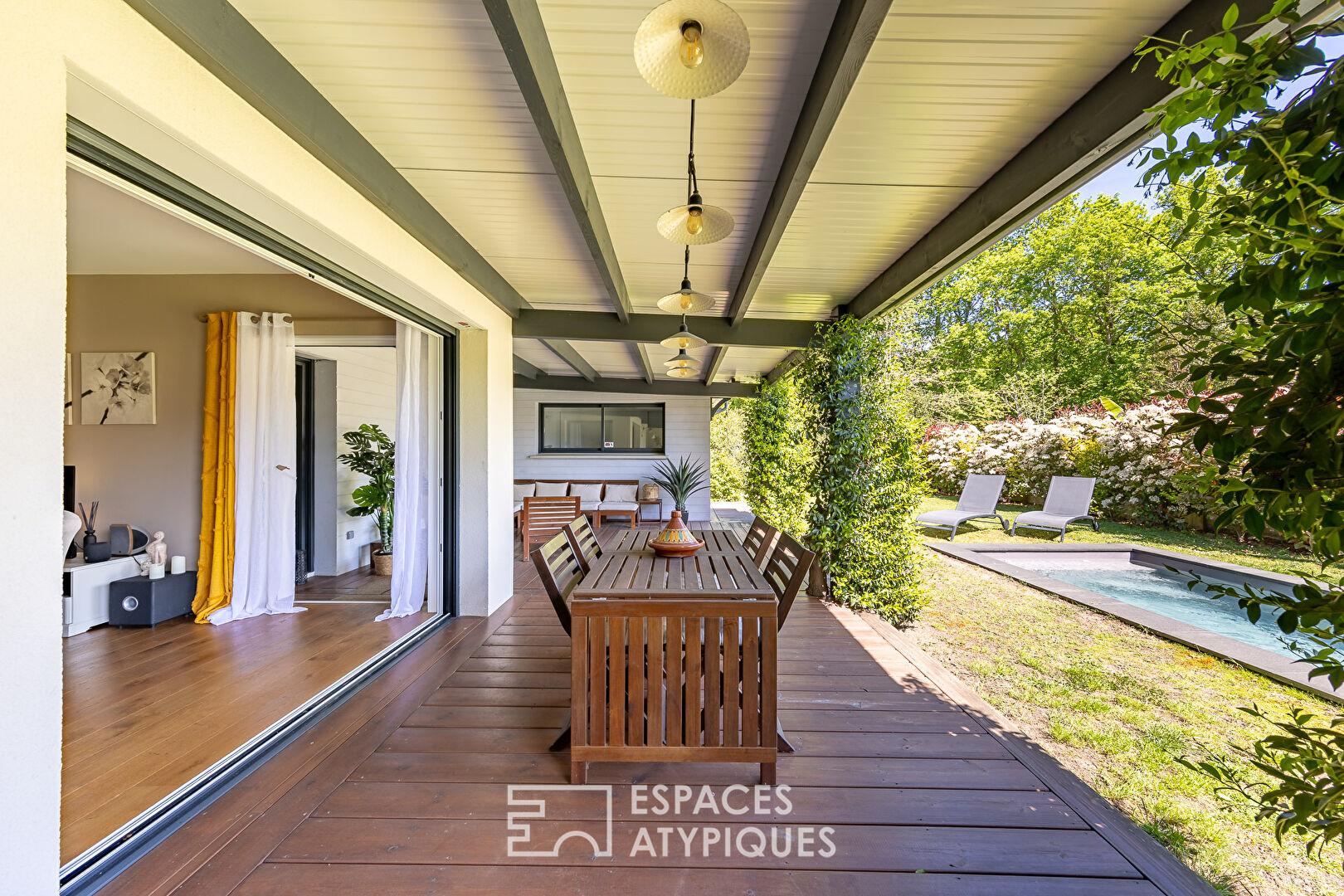 Dès l’entrée, le ton est donné : briquettes structurelles, carreaux de ciment graphiques et escalier en bois massif composent une signature esthétique forte. La cuisine, pensée comme un espace de réception, s’ouvre sur un salon chaleureux prolongé par une vaste terrasse couverte, créant une continuité fluide entre intérieur et extérieur. Le jardin paysager, agrémenté d’un bassin de détente, offre un cadre intime et apaisant.