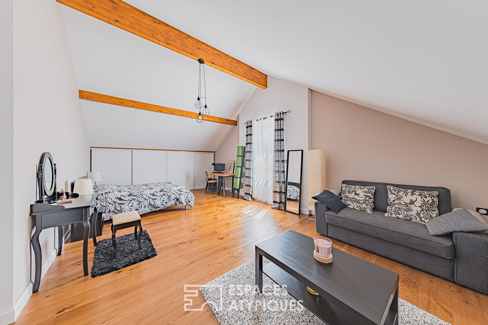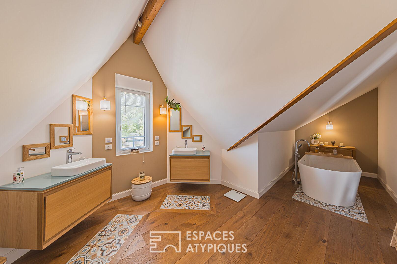 L’étage est dédié au repos. Sous une charpente apparente, les chambres déploient des volumes hors normes, portés par une clarté omniprésente. La salle de bain « Signature », avec sa baignoire îlot sculpturale nichée sous les combles, marie bois texturé et motifs hydrauliques pour une expérience sensorielle unique.