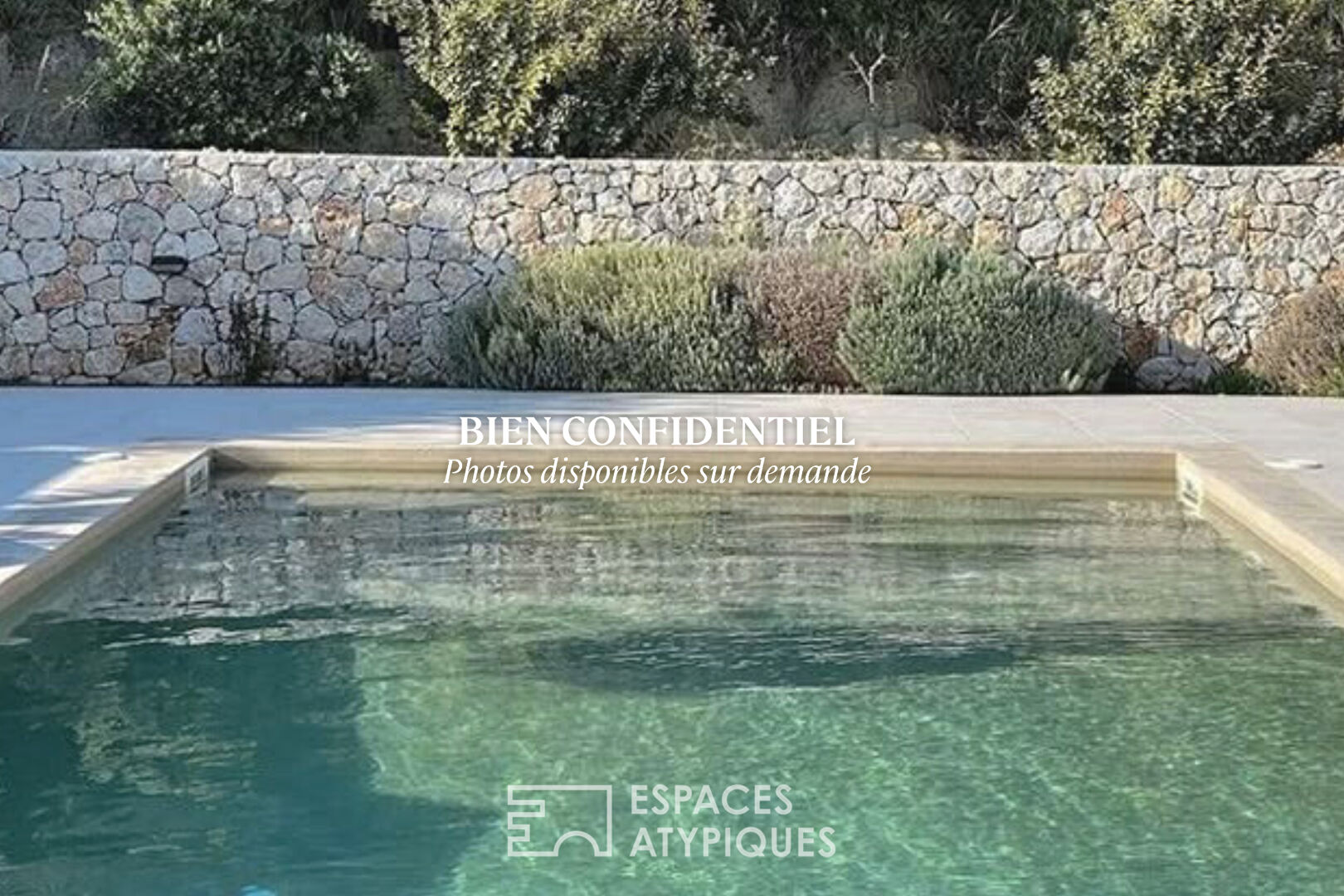 Il accueille un bassin en pierres qui fait office de piscine et est bordé de vastes terrasses, à la fois ouvertes et couvertes, prolongeant ainsi les espaces intérieurs.