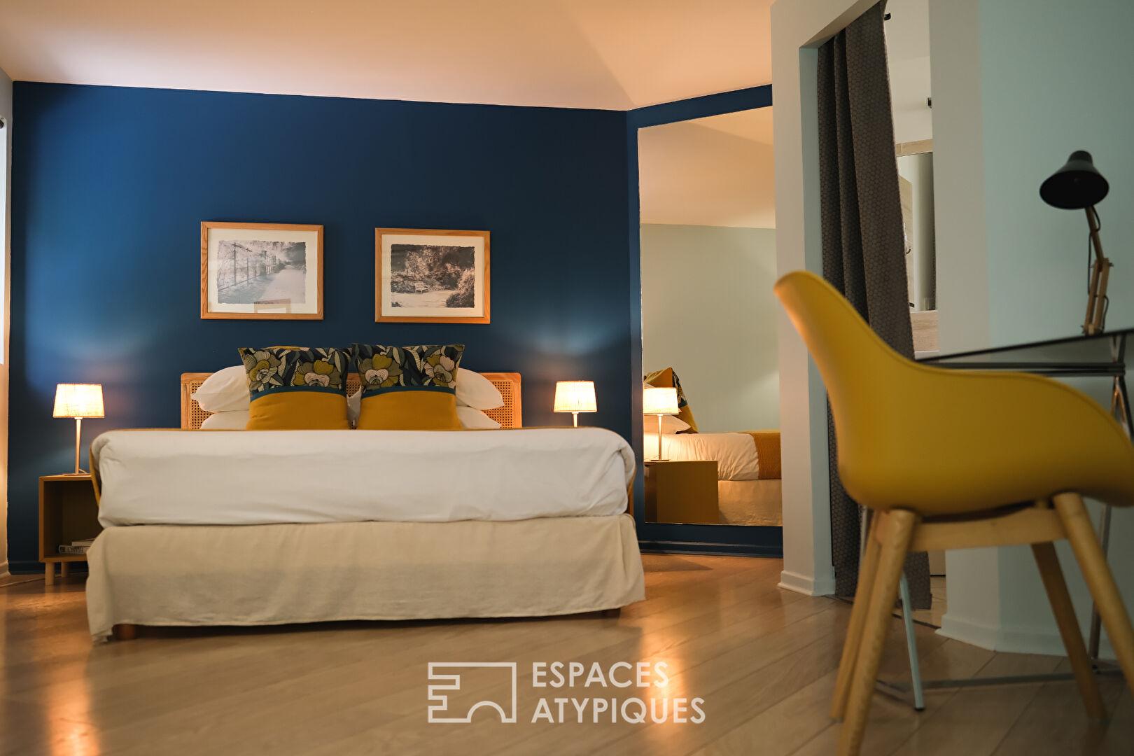 La partie privative, lumineuse et élégante, offre aux propriétaires trois chambres supplémentaires, un salon chaleureux et une cuisine aménagée. L’ensemble est sublimé par un escalier en fer forgé, pièce maîtresse qui confère un cachet inimitable à cette demeure singulière.
