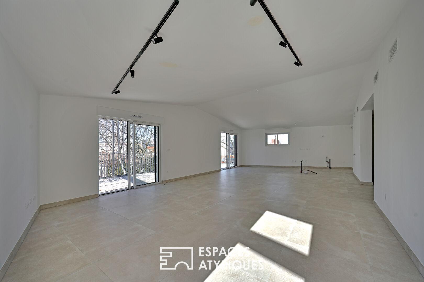 À deux pas de la gare et du centre-ville de Montpellier, ce rooftop contemporain de 135 m² occupe le dernier étage d’une résidence récente (2021).