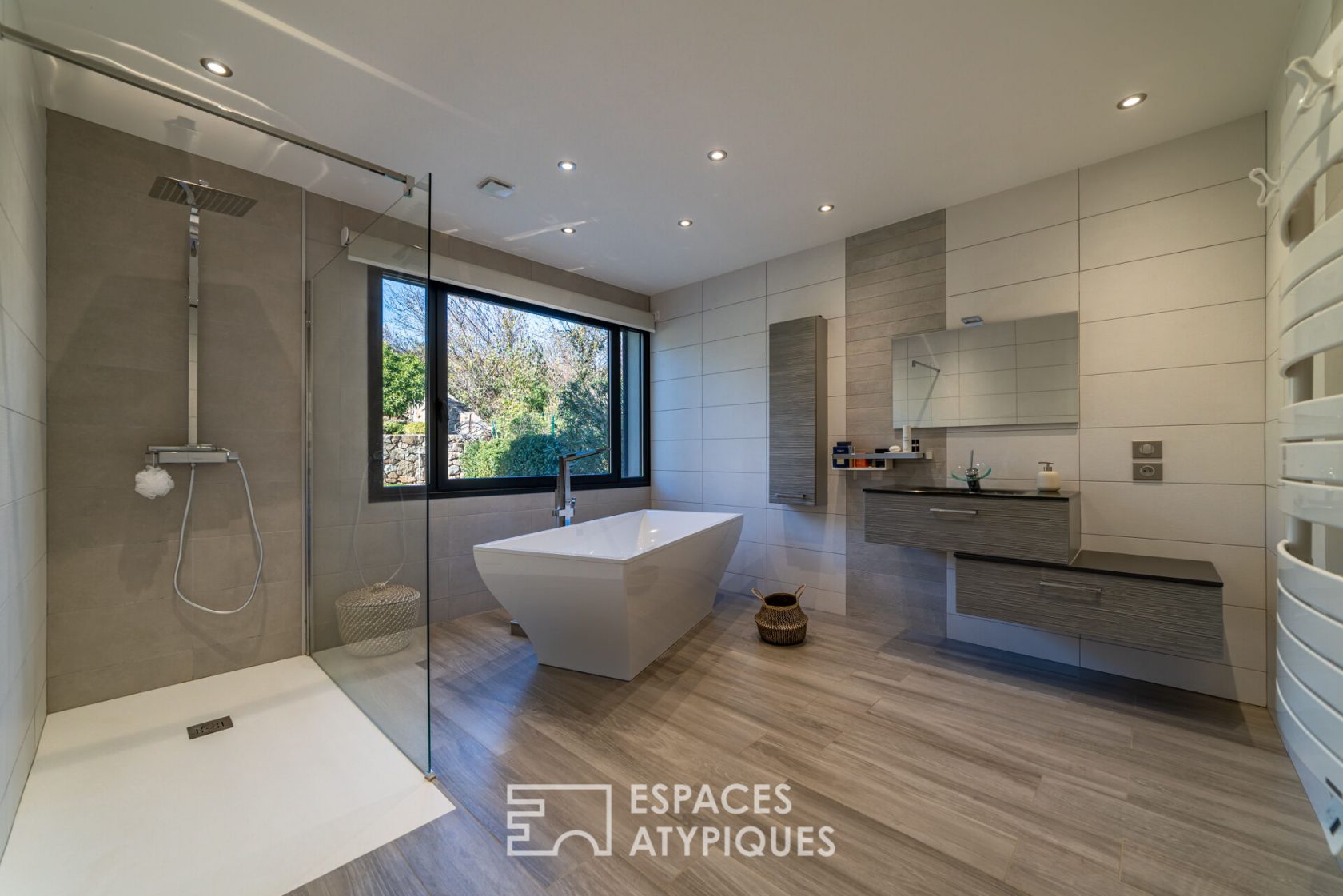 Proposant de hautes prestations, cette maison récente équipée d’un ascenseur desservant ses trois niveaux propose un cadre de vie articulé autour de beaux volumes et de nombreuses ouvertures, offrant une belle luminosité et une vue sur le terrain arboré, équipé d’une piscine miroir 12×6 mètres avec jacuzzi intégré, d’une cuisine d’été et d’un espace Spa.