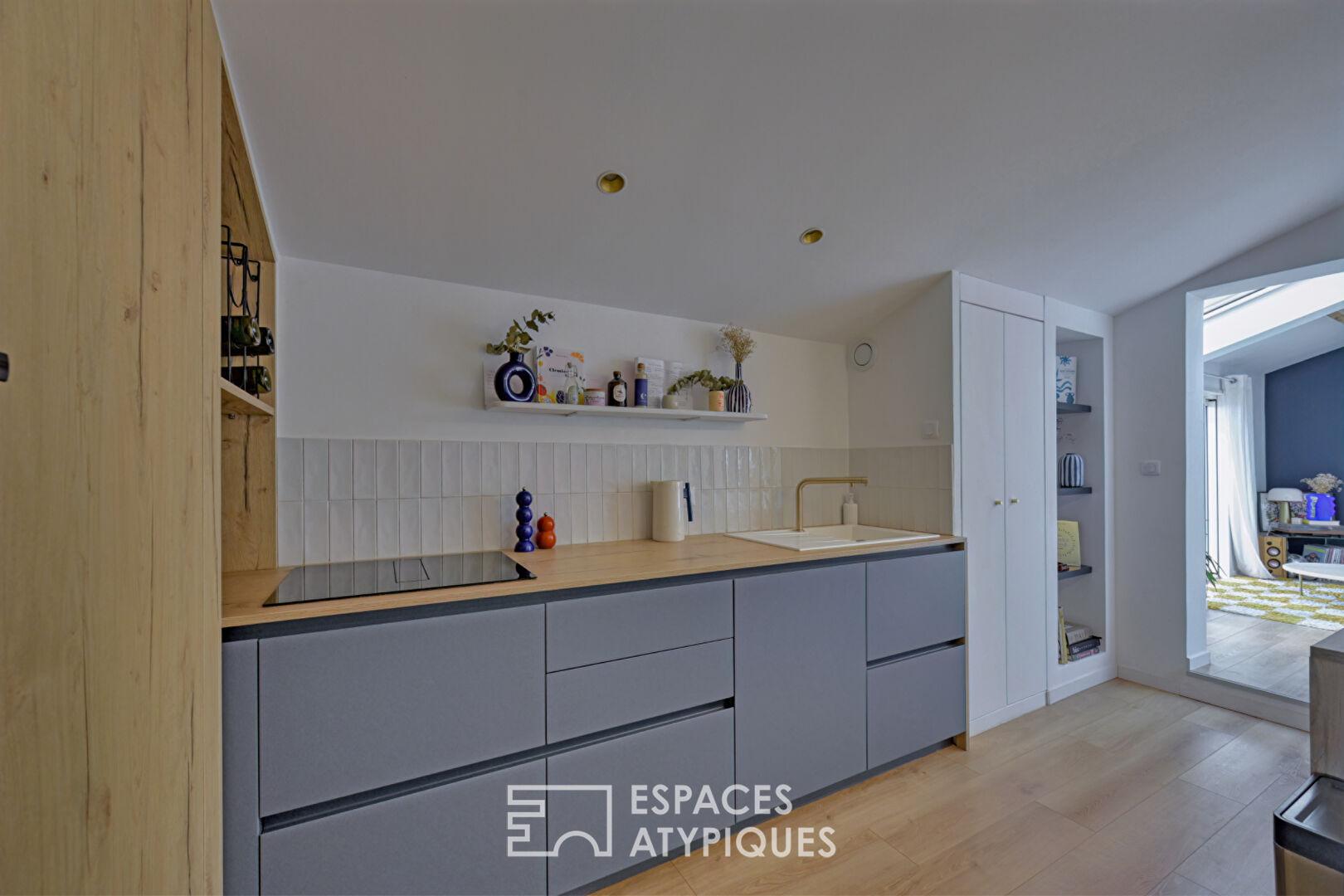 Un escalier conduit au niveau supérieur qui accueille une seconde chambre ainsi qu’une pièce de vie lumineuse intégrant une cuisine équipée et aménagée.