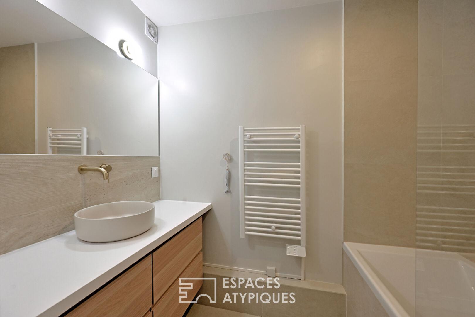 Cet espace de vie se prolonge naturellement vers une terrasse de 14 m² sans aucun vis-à-vis. Exposée Sud-Ouest, elle permet de profiter de la lumière du jour jusqu’au crépuscule.