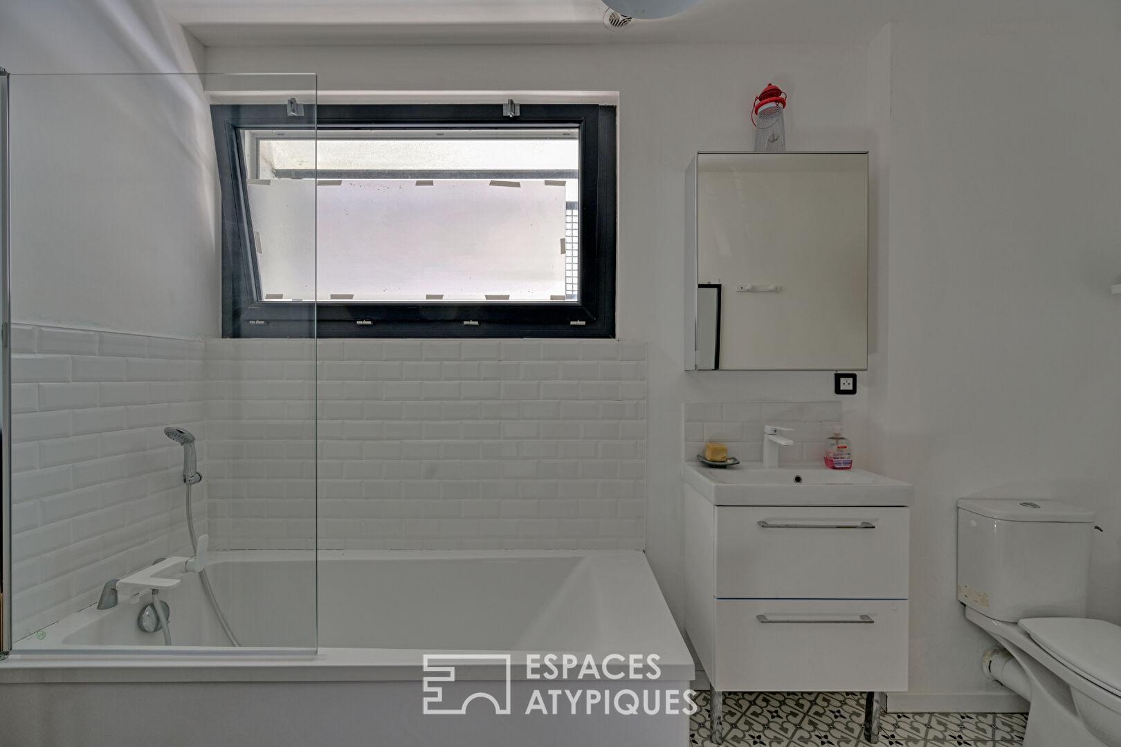 Au rez-de-jardin, un studio avec terrasse et un appartement une chambre offrent des espaces indépendants, parfaits pour accueillir invités ou télétravail, tandis qu’un escalier mène à l’étage, coeur de la maison et espace de vie principal.