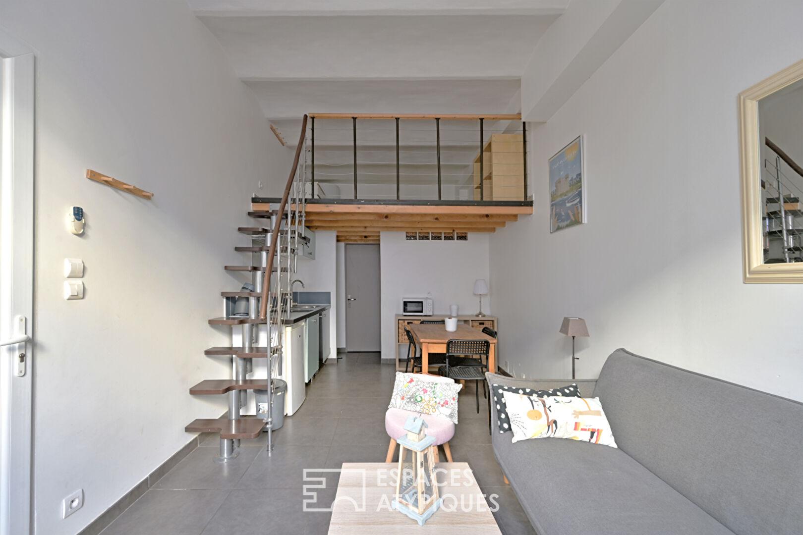 L’espace se prolonge sur une terrasse de 30 m² nichée sur les toits, véritable belvédère sans aucun vis-à-vis et bénéficiant d’une jolie vue mer ainsi que sur les toits environnants.